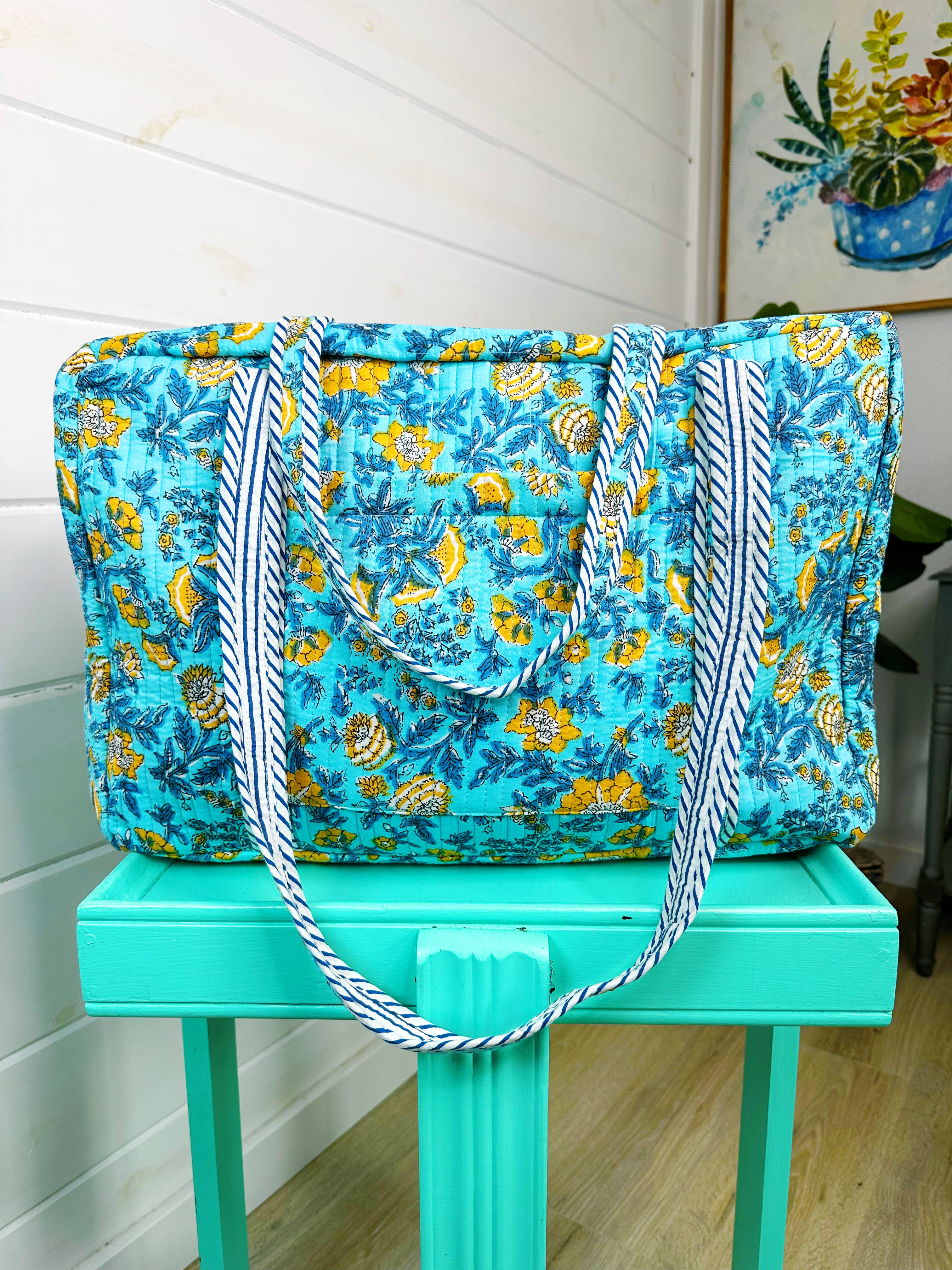 Based in the Lake of the Ozarks, Missouri, we are a female owned business. We partner with skilled Indian artisans to create vibrant, hand printed quilted bags — including totes, weekenders, cosmetic bags, and more. Our bold colors, unique prints, and thoughtful designs are made to stand out on your shelves and delight your customers. We also offer sustainable leather goods made from upcycled scraps, giving new life to materials discarded by the leather industry. All items are in stock and ready to ship within 1–2 business days. Have questions? We’re happy to help!