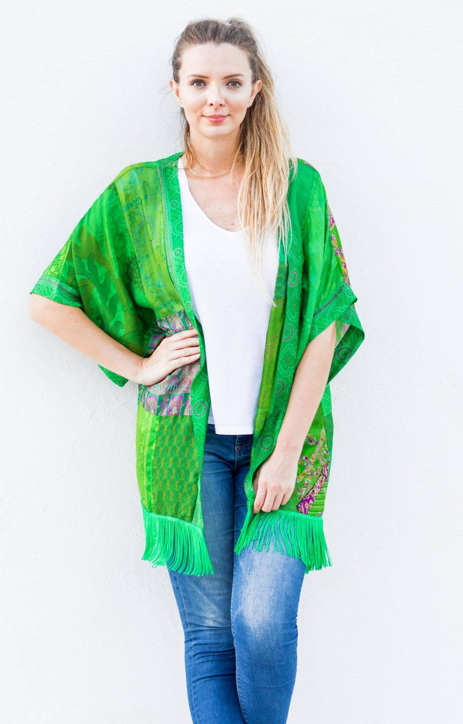 GreenSewn creates unique and sustainable one of a kind scarves and wraps by recycling old vintage silk saris. If you don't know what a sari is, it's a long (usually 15 feet or more) garment worn by women in India. Our recycled vintage sari scarves are colorful, intricately patterned, and sometimes have fancy gold "zari" work hand woven into the borders. We collect the softest and prettiest old saris and lovingly recycle them into luxurious, authentic, ultra limited edition and gloriously colorful green fashion creations that are both fashionable and sustainable.