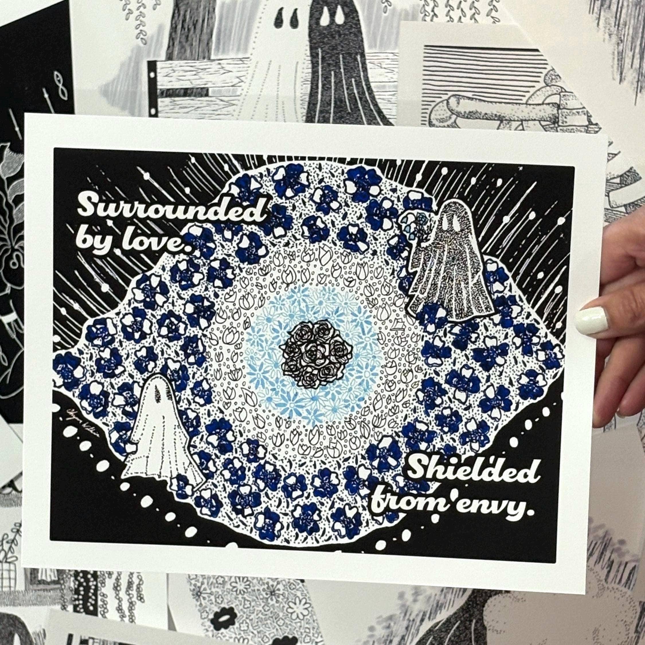 I’m Chynna, the artist behind Solo Souls. All of my illustrations are drawn by hand using pen and ink. My work consists of the life of a black sheet ghost and of empowered divine bodies. Art is meant for everyone. I think we can all relate to the comfort of sheet ghosts, and we all have our moments where we feel divine. The idea behind my art is reclaiming individuality and self-acceptance. Ask yourself, “How do I see myself when no one is looking?”