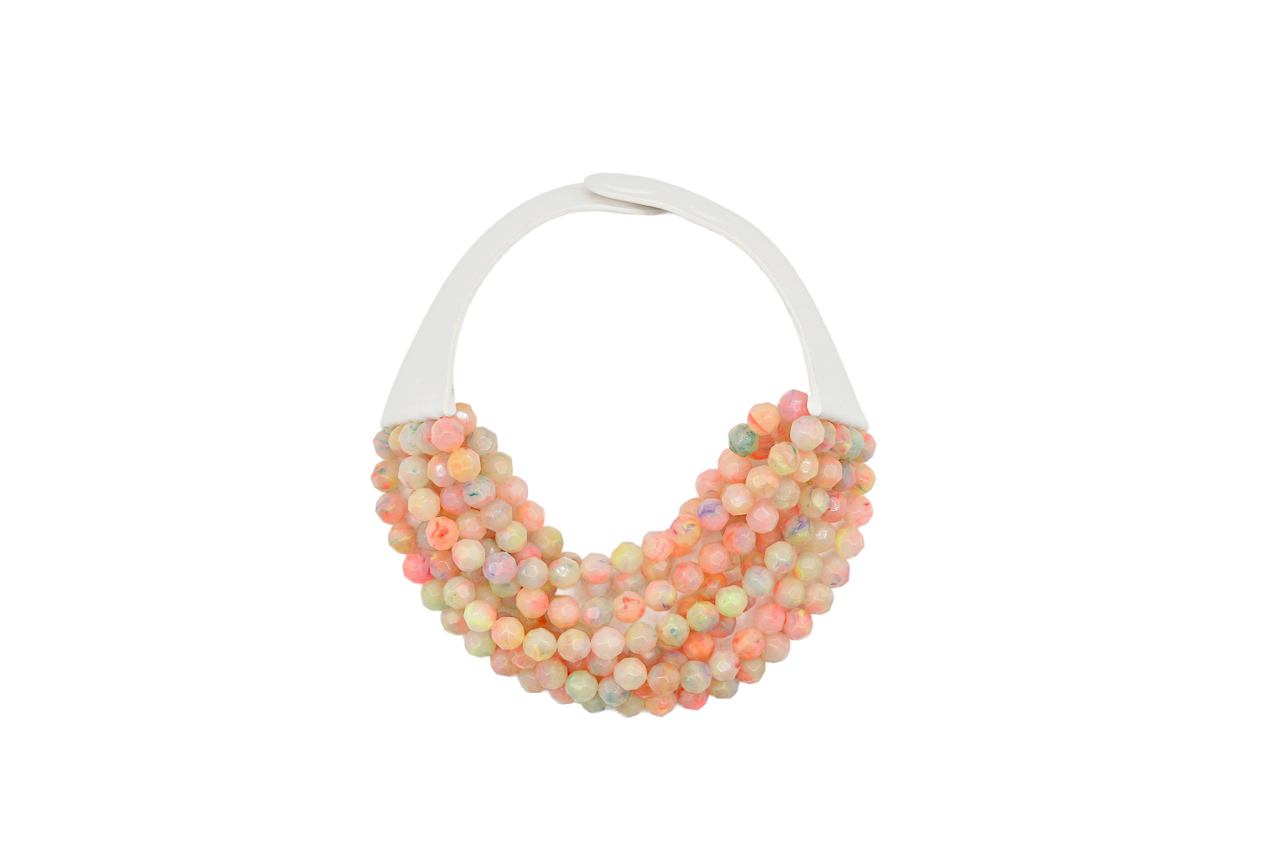 EACH FAIRCHILD BALDWIN COLLECTION IS CAREFULLY HANDMADE FROM START TO FINISH. JILL FAIRCHILD PERSONALLY DESIGNS EACH AND EVERY NECKLACE, A TRUE LABOR OF LOVE FOR JILL AND HER TALENTED TEAM. A NECKLACE TAKES ANYWHERE FROM 5 TO 7 HOURS TO PRODUCE AND WE PRIDE OURSELVES ON OUR EXCLUSIVE MARBLE TREATMENTS, WHICH RESULT IN UNIQUE COMBINATIONS THAT MEANS MANY OF THE NECKLACES ARE TRULY ONE-OF-A-KIND. TRANSPARENT COLORED BEADS, OPALINES, MATTES, FULL COLORED BEADS AND IRIDESCENT S ROUND OUT THE ASSORTMENT. EACH NECKLACE IS COMPLETED BY OUR OWN COLORS OF SUMPTUOUS LUXURY LEATHER COLLARS WITH HAND-PAINTED EDGES AND OUR SIGNATURE ADJUSTABLE MAGNETIC CLOSURE.
