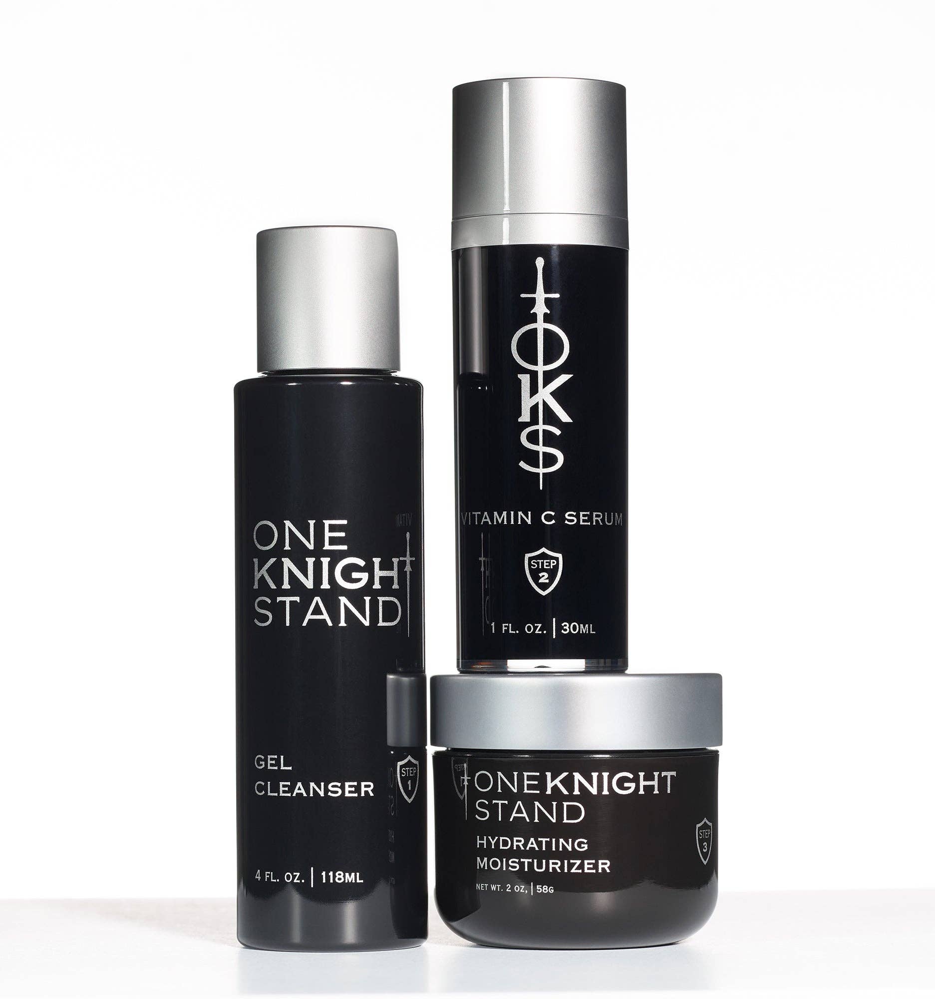 One Knight Stand was created by two best friends on the journey to understanding skin health with young adults. Our revolutionary 3 step routine is made with gentle ingredients and is the easiest skincare routine to follow in the market. Step 1 - Gel Cleanser: Indulge your skin in the embrace of our sulfate-free cleanser, enriched with the restorative properties of coconut water and aloe. Experience the sublime sensation of smoothness, hydration, and refreshment that leaves your skin revitalized. Step 2 - Vitamin C Serum: Unleash the power of our potent Vitamin C Serum, meticulously formulated to shield your skin from free radicals and invigorate it with an extraordinary blend of concentrated caffeine and vitamin C. Witness the remarkable revival of your skin's radiance. Step 3 - Hydrating Moisturizer: Elevate your hydration game with our unparalleled moisturizer, meticulously crafted with a fusion of caffeine, sea salt, and niacinamide. Immerse your skin in next-level nourishment, leaving it replenished, revitalized, and deeply hydrated.