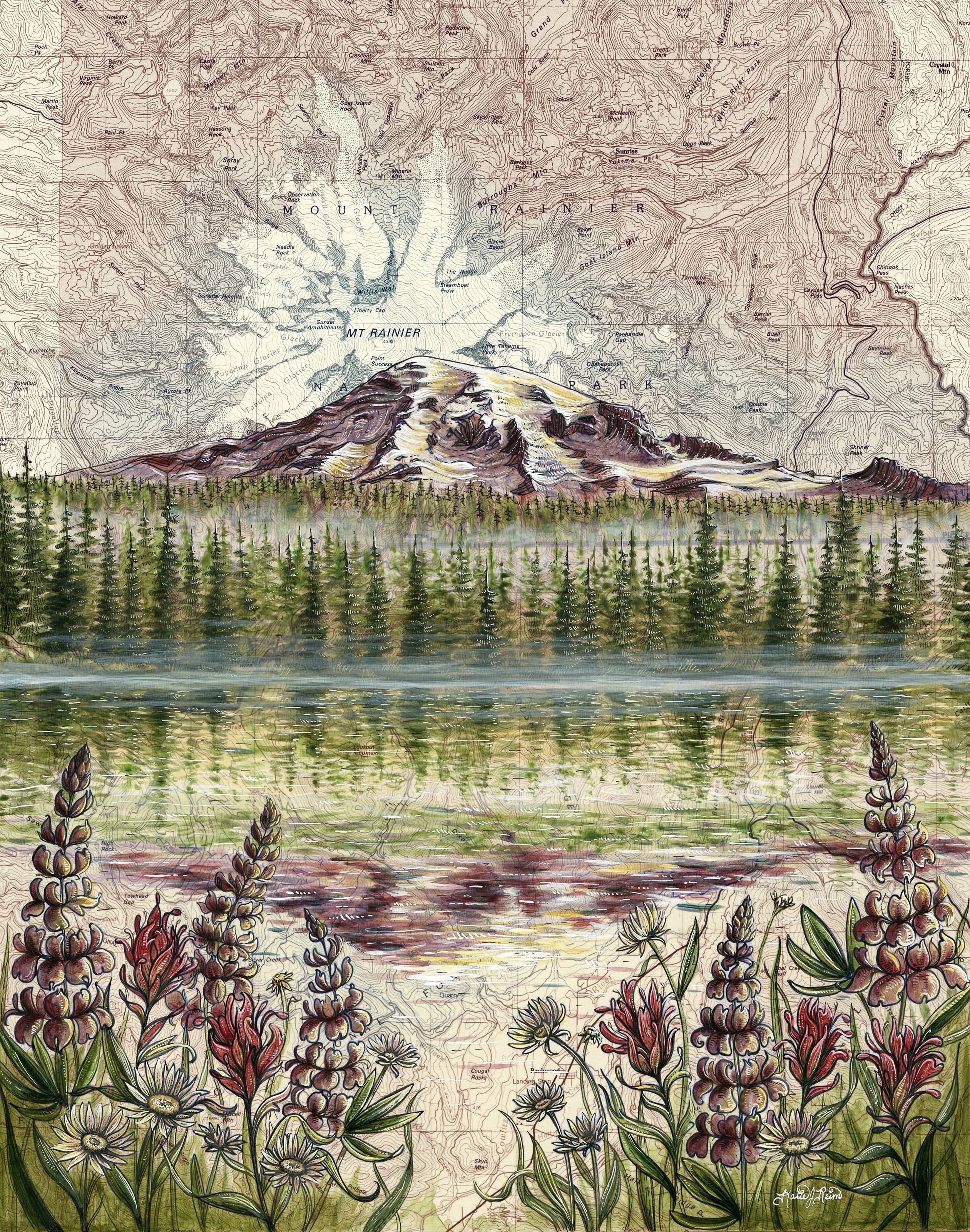 Aiming to capture the connection people feel towards their favorite wild places, Portland artist Katie Reim offers her paintings as prints, cards, and quality outdoor goods. Fascinated by the lines on topography maps, Katie pairs them with the inspirations and adventures she seeks in nature.