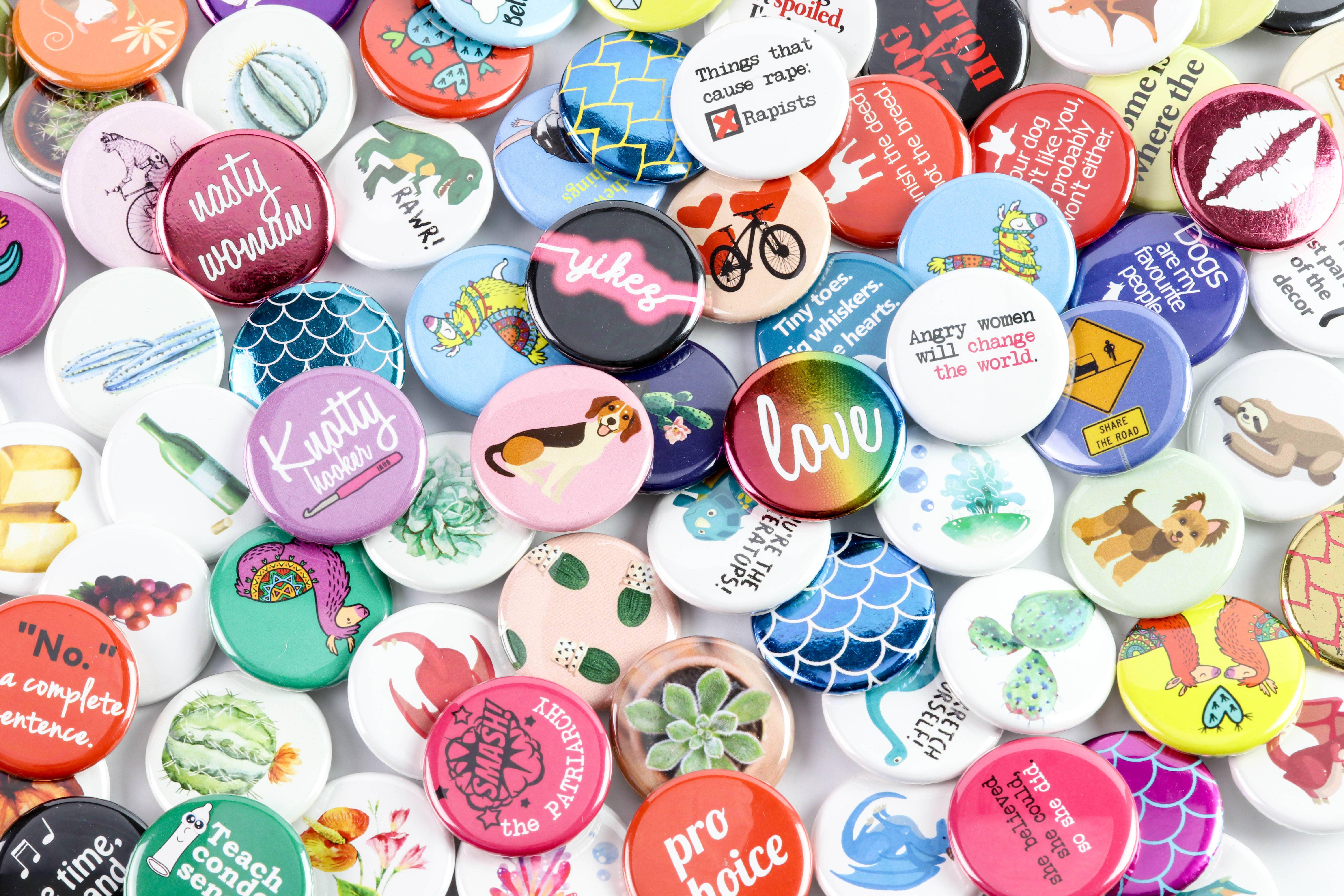 Ifs, Ands, or Buttons is all about that flair: for your passions, your purpose, and for your self-expression. We are unapologetically progressive and inclusive and aim to make products that let you say so much, without even uttering a word. Buttons, magnets, patches, stickers and more - all with the goal of standing out and standing proud. Kaitlynne-Rae is based in Ottawa, Canada and is a queer, neurodivergent, fat woman with a love of intersectional feminism, social justice, animals, and the environment. These passions, along with a healthy dose of sarcasm and attitude, inspire the designs. Many of the items donate to various charities and community causes, as noted in individual item descriptions. Reused, upcycled, or eco-friendly packaging is used for bulk orders.