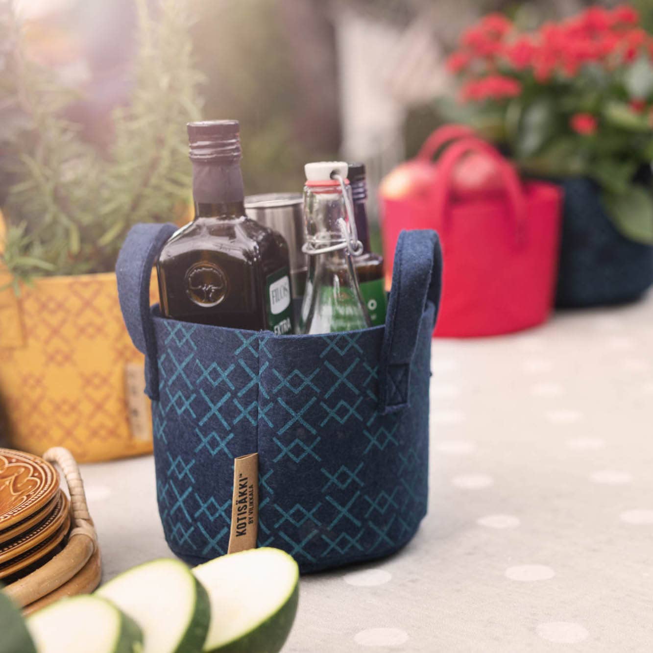 Vilikkala is the brand for bags and baskets for everyday carrying and storing needs at home, office and garden. Our products are designed in Finland and crafted into bags in Finland, China or Estonia. Our inspiration derives from the way of living at the countryside in Vilikkala - a small village in Southern Finland. We use ecological materials like felt made of plastic bottles (rPET) and upcycled textilefibres. We are constantly renewing our selection with new exiting items. We are part of the Finnish textile ecosystem and our ambition and future is to refine textile waste into usefull everyday items based on circular design principles. You can use our Instagram account to find out more how are products are used and see all the stories behind the products. From our own web site our customers can purchase only for deliveries in Finland. We would love to have you selling our products in your markets. Product description in the packages are in Finnish, English and Swedish. They include short care instructions and material explanation. Ideas for use are printed as symbols.
