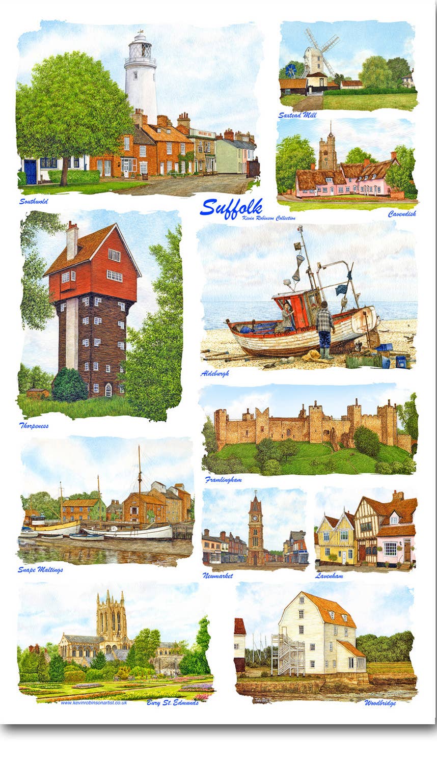 Based in the UK, the Kevin Robinson Collection is a range of Giftware and Souvenir products that feature designs created by Kevin and taken from his original Watercolour Paintings. Kevin started as an Artist in 1986, gradually introducing more products over the years, until creating the Kevin Robinson Collection in 2015. All products are carefully selected and designed by Kevin and are made in the UK. Currently working on extending areas covered , and finding more quality products to have his images produced on. The latest is a venture into Kitchen Fabrics, Tea Towels , Oven Gloves, Pot Holders and Hob covers. We have a range of products for The Lake District, County Durham, York, Peak District, Lincoln, The Cotswolds, Norfolk, Suffolk, Cambridgeshire, Essex, London, Warwickshire and Cornwall. Wiltshire and Dorset are the latest regions in the range.