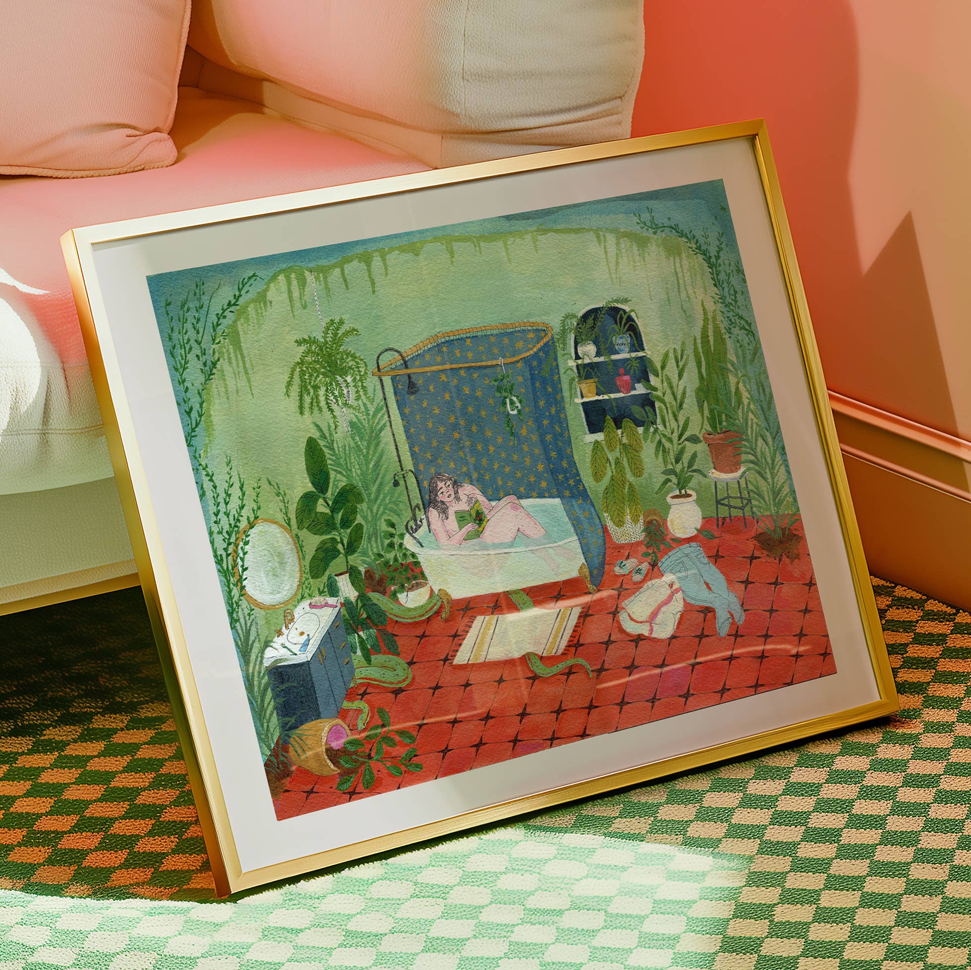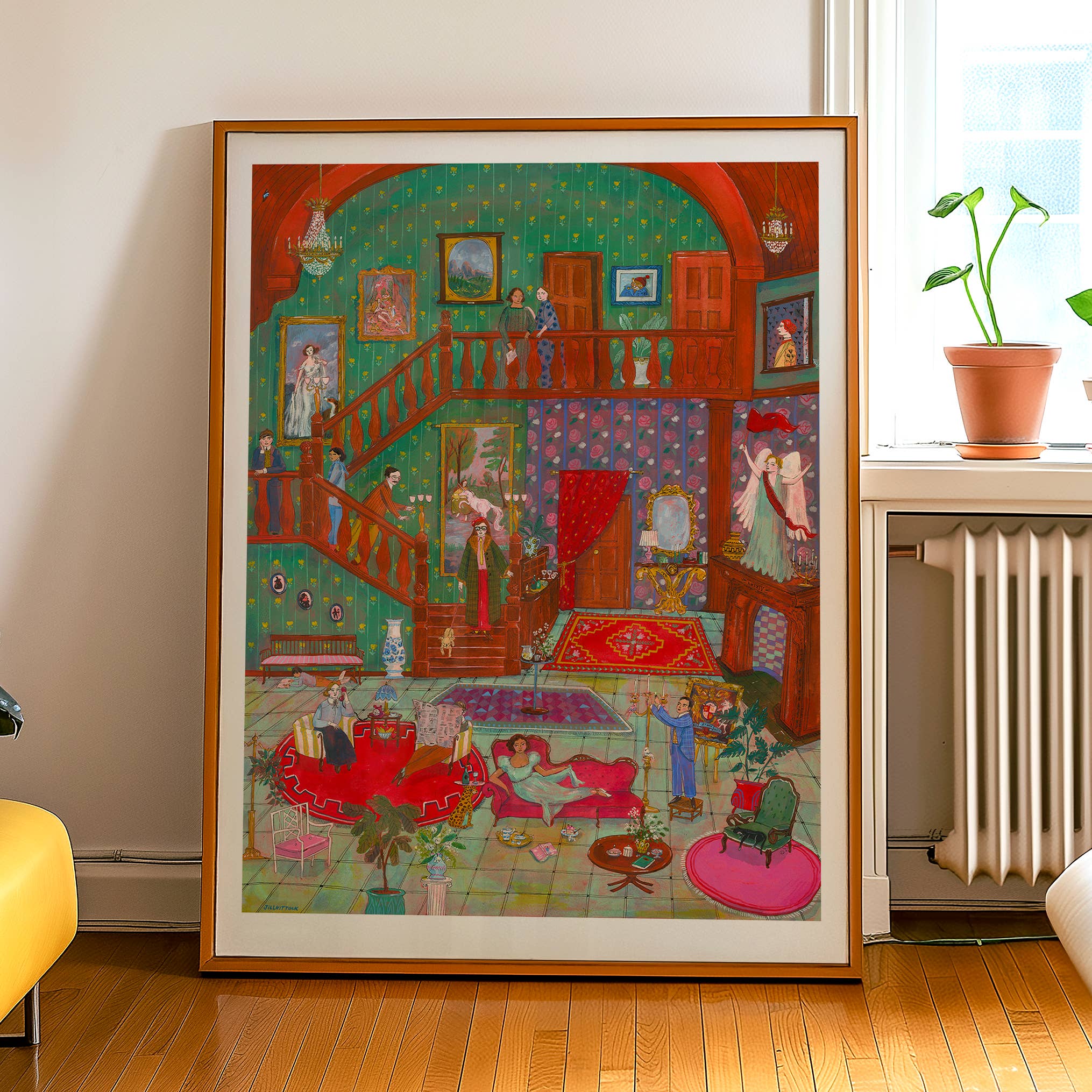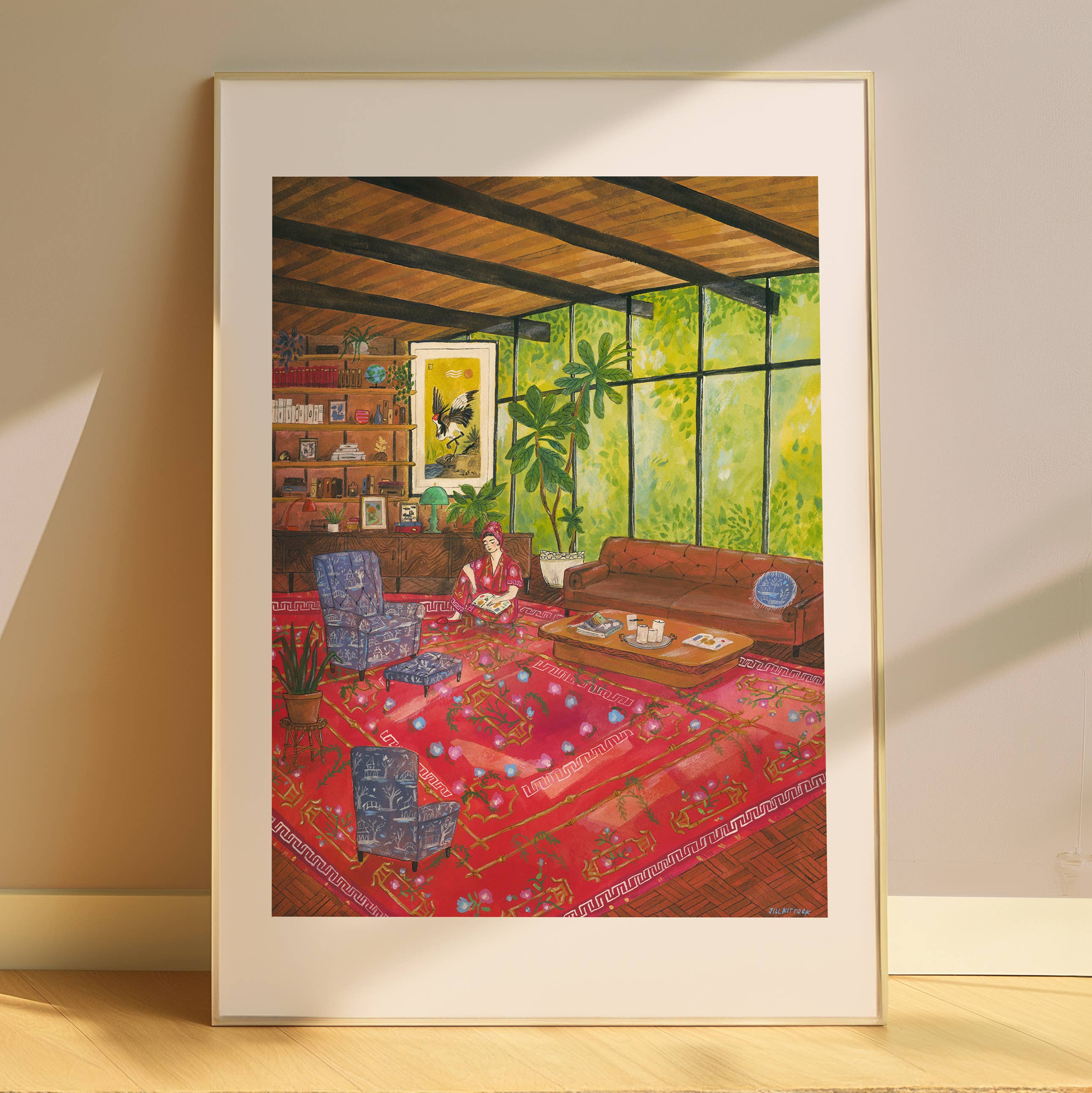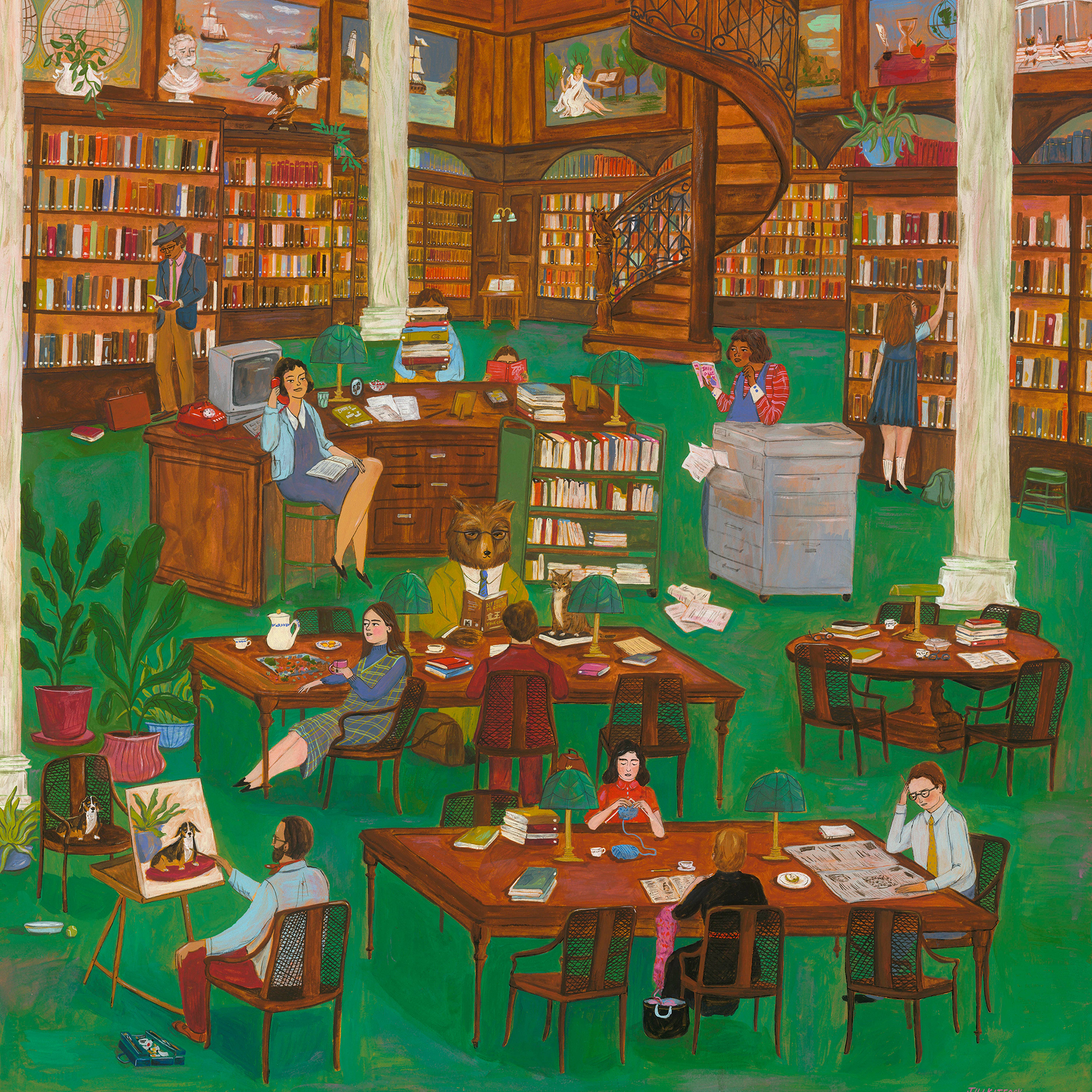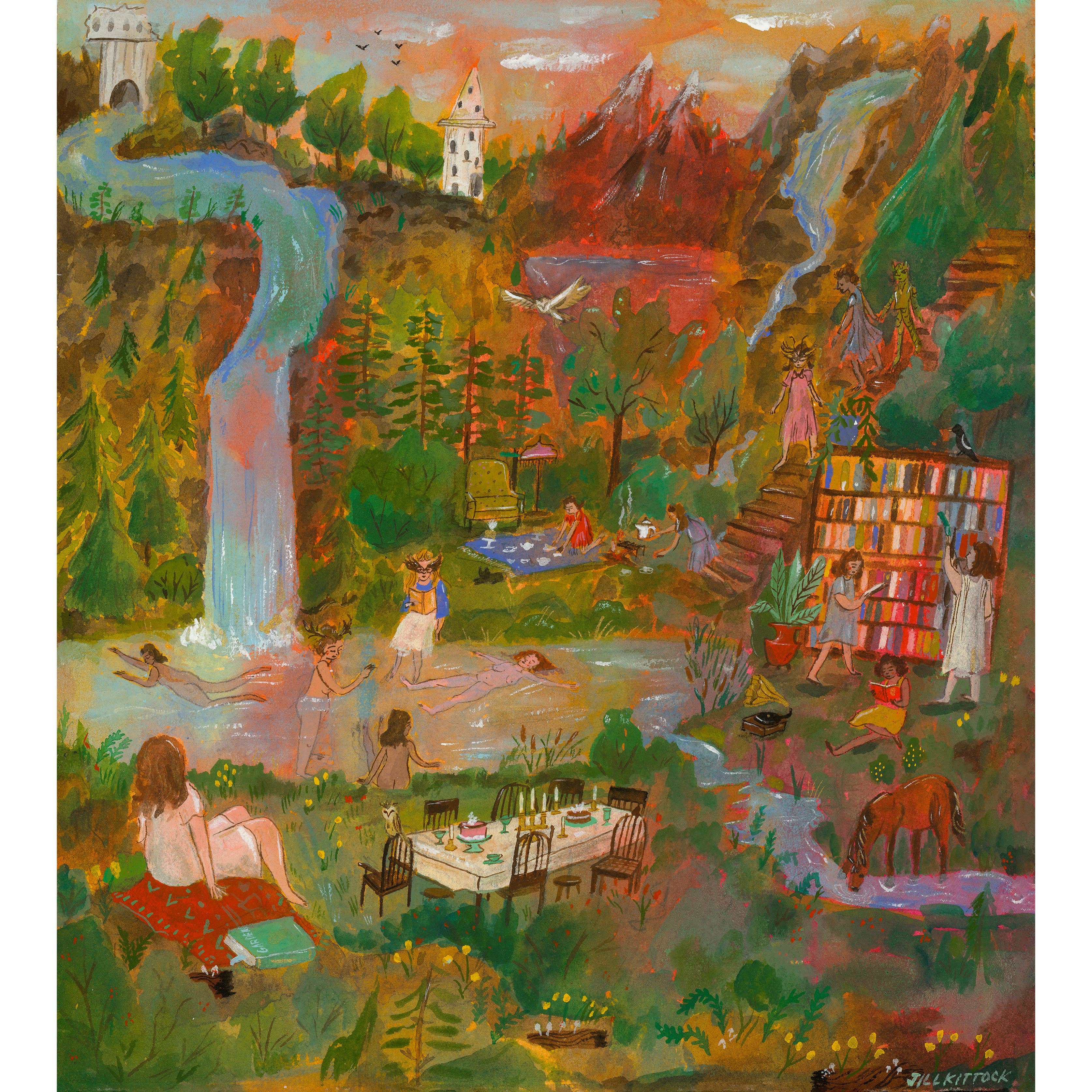 Jill paints people in intricate, lush spaces. Her work is saturated with clever details and symbolism, encouraging the viewer to see something new upon each look. Through rich imagery, Jill hopes to convey the lavishness of life, the peacefulness of a moment alone with a book and a snack, the warmth of friendship, and sometimes the dark weirdness of being alone in the modern world. She works primarily in acrylic gouache and pen and ink. You'll find her artwork as gicleé prints, brightly colored Risopgraph prints; on cards, stickers, buttons and t-shirts. Jill regularly shares her art process through her popular monthly e-newsletter, teaches workshops, and loves to connect with aspiring artists and art fans alike. Follow along @jillkittock on Instagram and subscribe to her monthly newsletter.