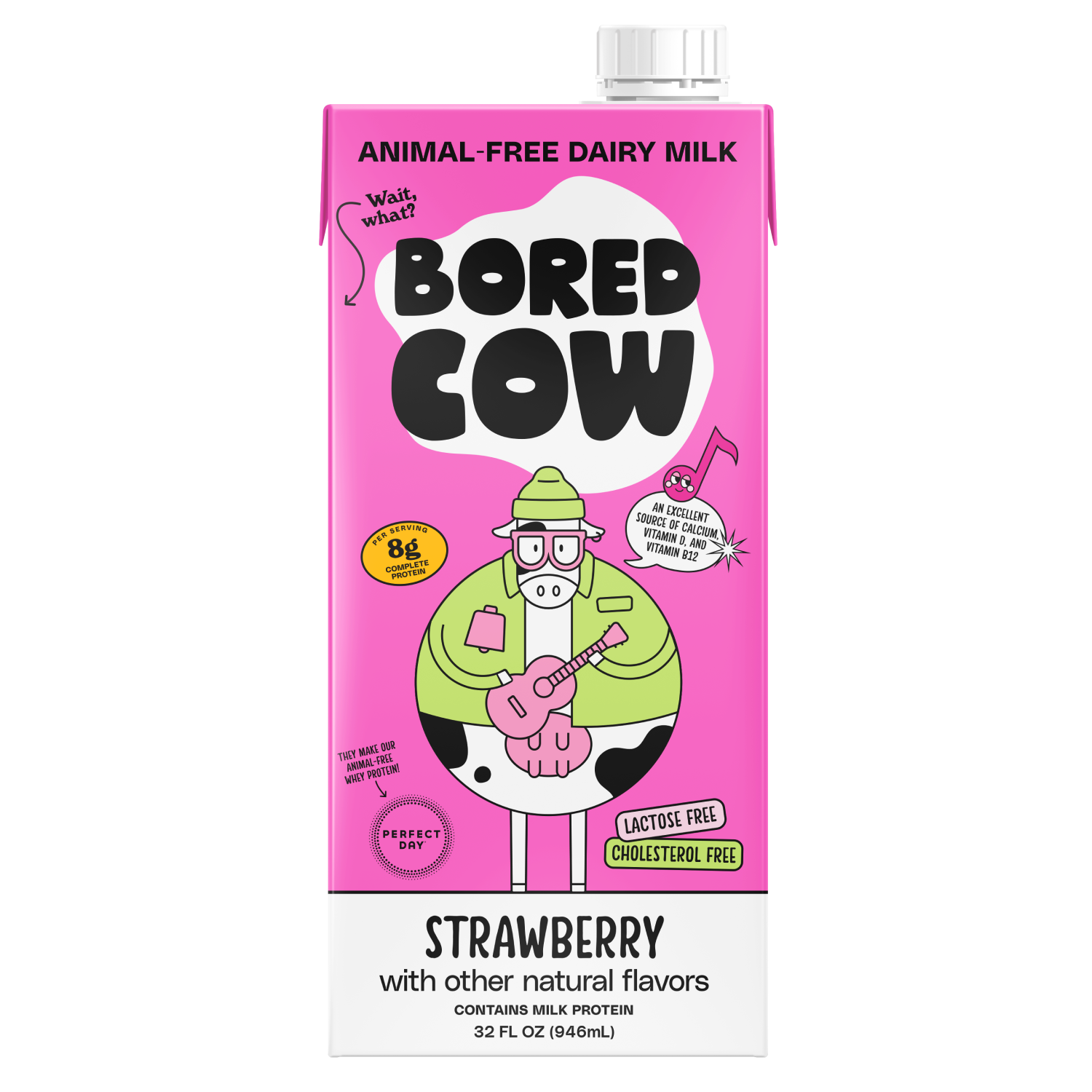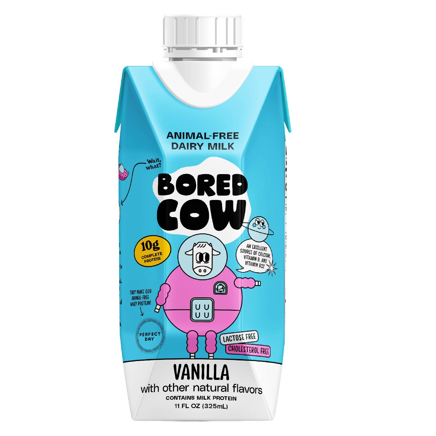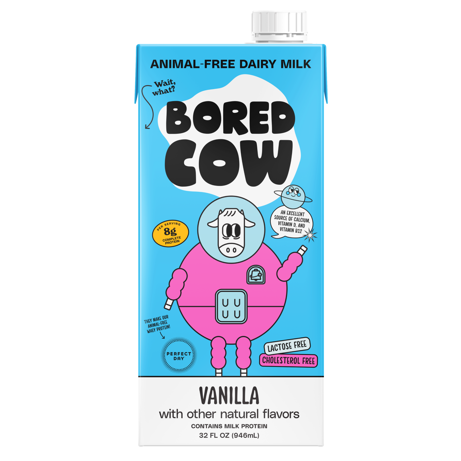 REAL DAIRY, NO COW. The first milk alternative to do it all. Bored Cow is the first milk alternative that truly replaces dairy milk in look, feel, smell, taste, and function without the negative environmental and animal welfare impacts. It cooks, bakes, and froths like real dairy, because it is! It contains real milk protein made via precision fermentation. At the end of the process, we get an animal-free whey protein that is bio-identical to conventional whey. We then build a plant-based milk alternative around that, and fortify it with vitamins and minerals. Bored Cow animal-free dairy milk has 8g of sustainable milk protein per cup, and is an excellent source of calcium, vitamin D, and vitamin B12. We love dairy, but hate the impact it has on animals and the planet. So we set out to find a better way to make it – without factory farming, and with a fraction of the environmental footprint. Animal-free whey protein from fermentation generates up to 97% fewer greenhouse gas emissions, uses up to 99% less water, and requires up to 60% less nonrenewable energy to produce than conventional whey protein from cows. We believe the future of dairy is animal-free, and that cows everywhere deserve a break.