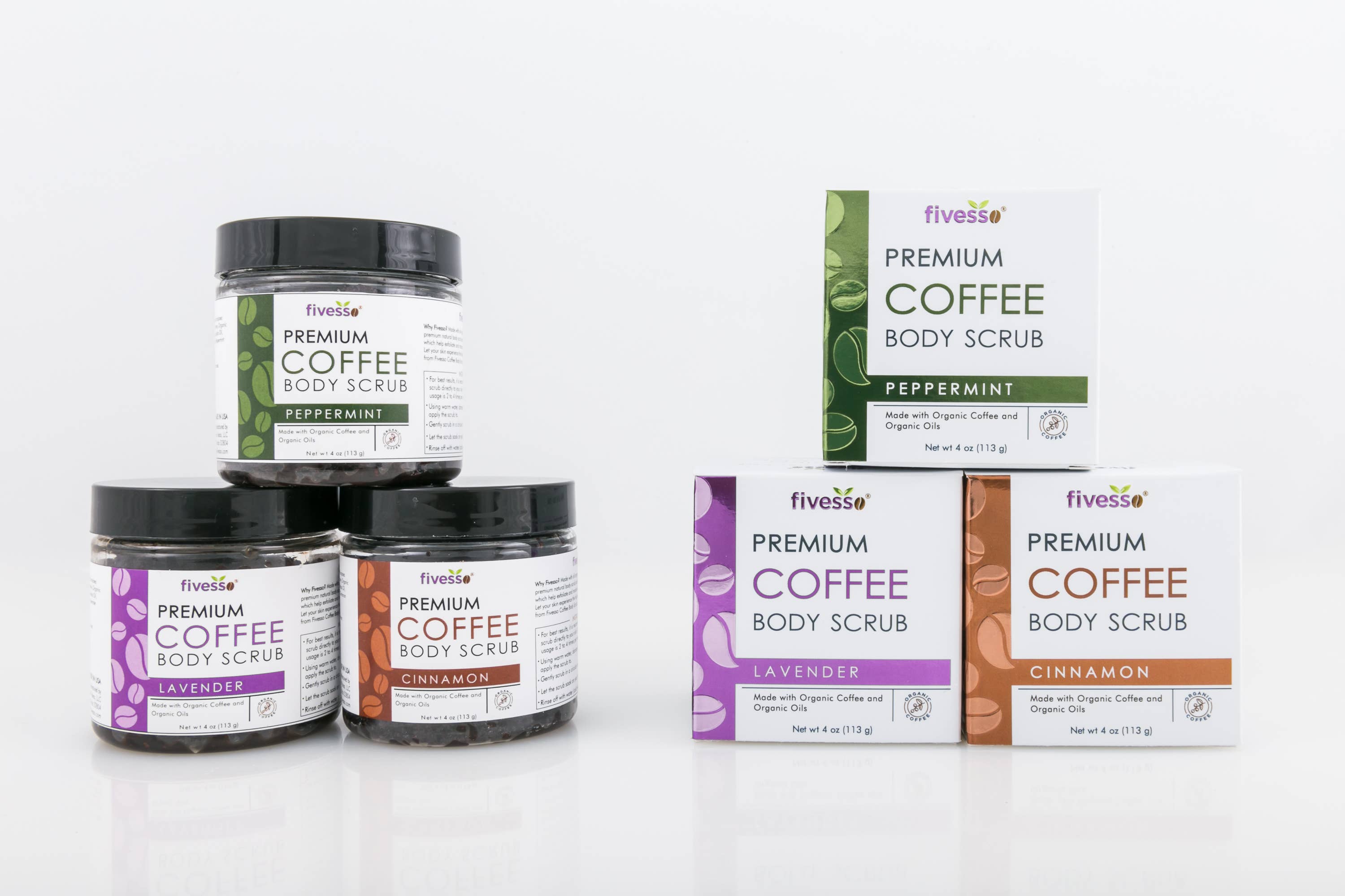 Discover Coffee Skincare. Designed for sensitive skin. Fivesso stands for the Five Organic oils we used throughout our products and -esso for espresso to represent coffee. We use organic coffee as our flagship ingredient at Fivesso because it has many important benefits for the skin. Organic coffee grounds are a great natural exfoliator. It does not contain any harmful chemicals such as pesticides, parabens, or sulfates. We are not the typical chemical detergent body soaps. Our mission is to push natural skincare awareness with our organic coffee skincare products. We love skincare and can spot (and feel!) the difference between mediocre and extraordinary products. Our products are made with the highest quality organic ingredients to both energize and moisturize the skin. We truly put in the work to create a luxurious experience from start to finish and can promise you’ll not only love the way your skin feels, but you’ll glow-naturally. We want you to Be natural and Feel Natural. Educating and spreading skincare awareness is very important to understand the benefits of an all-natural lifestyle. We believe to have good skincare is not just about using great products, but it's a lifestyle choice. Equally as important, we strive for excellence to provide the best product for your bathing/ showering experience. We do it with a high level of integrity, transparency, and honesty. We follow our values from top down bottom to ensure everyone that we do things the right way.