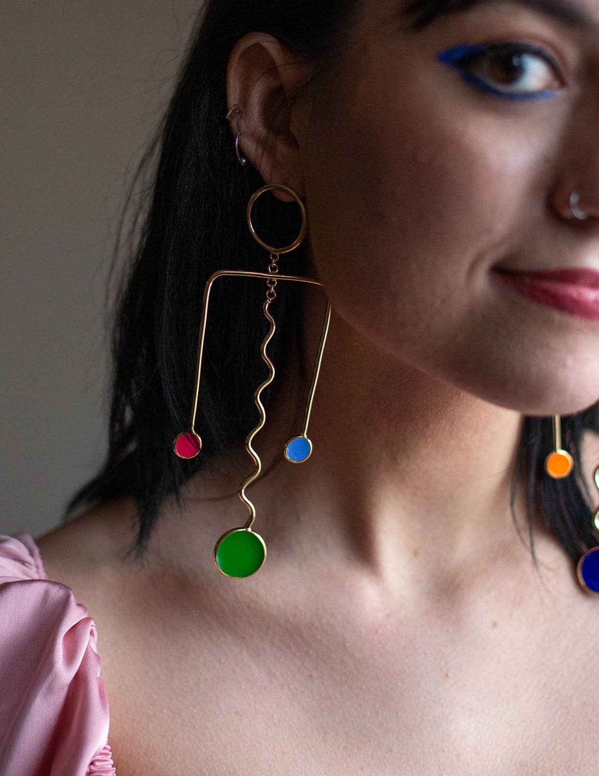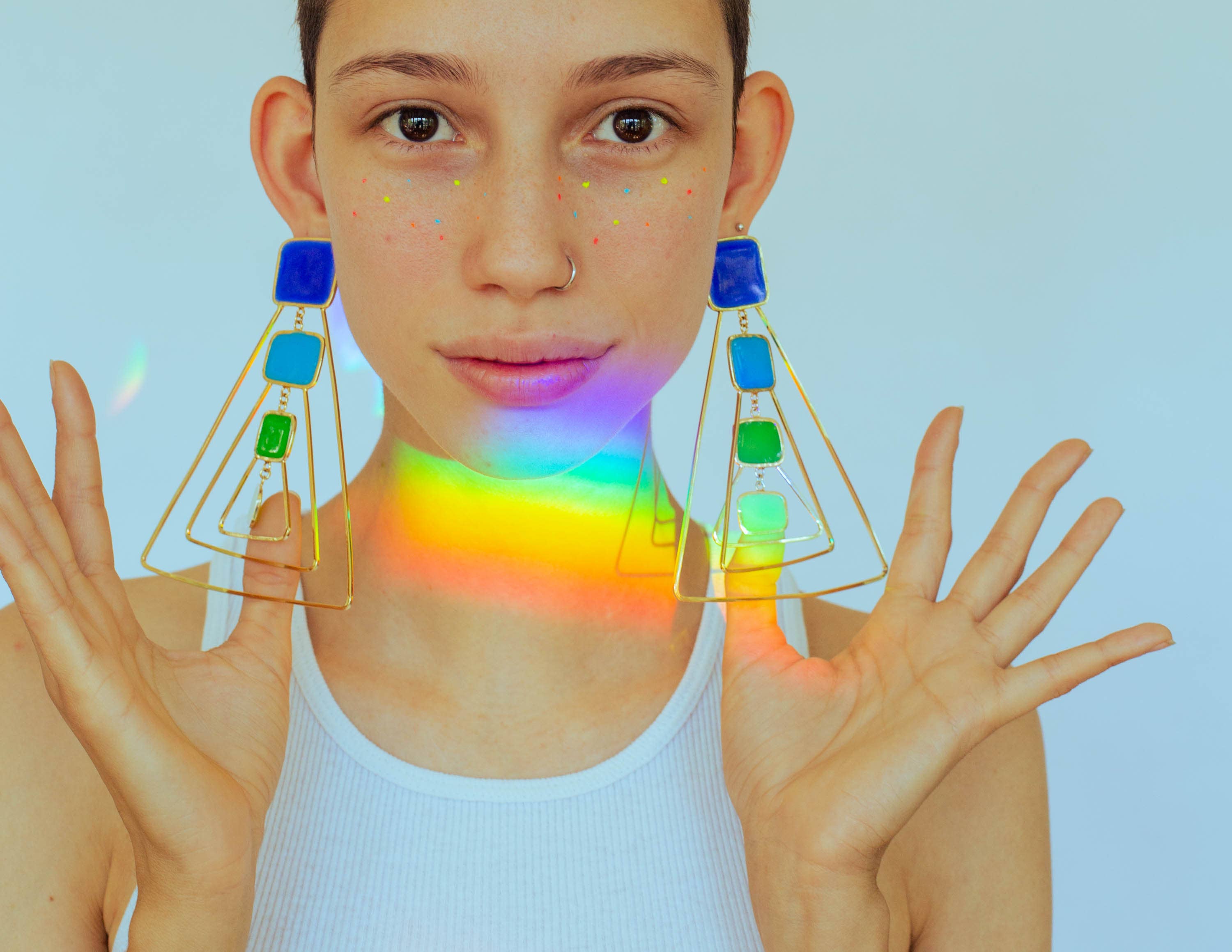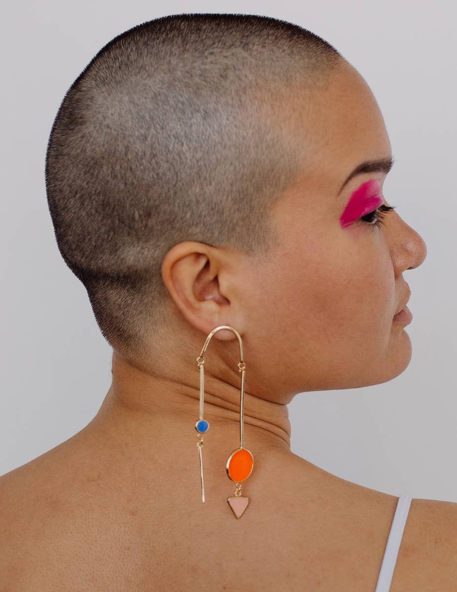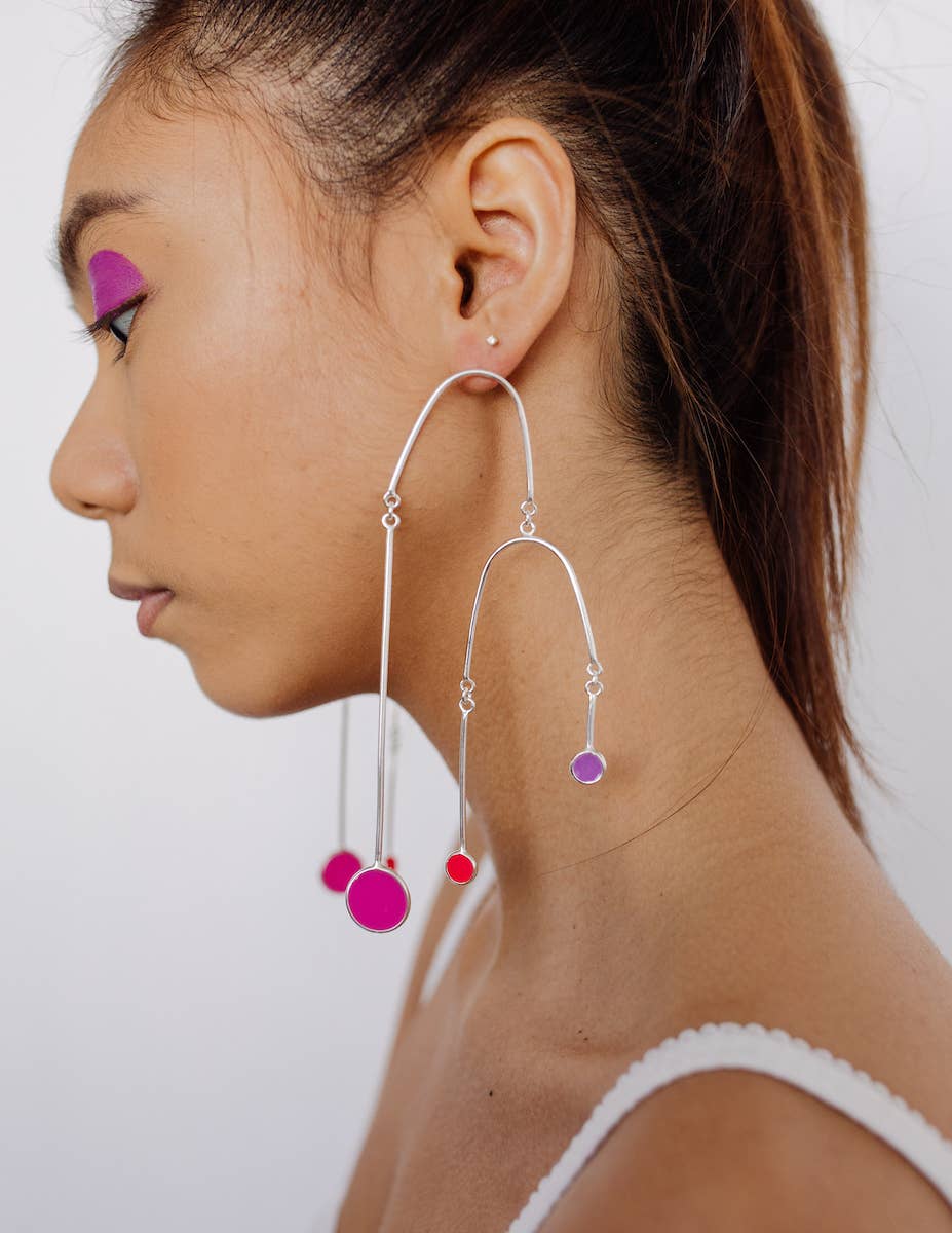 Sophia Sophia is a color-obsessed earring enthusiast who creates bold, handcrafted jewelry for anyone but wallflowers. Her statement pieces are known for their unapologetic use of vibrant color, playful proportions, and sculptural forms—wearable art meant to spark conversation. Each piece is treated as a true work of art. Sophia draws inspiration from a wide range of sources: her eclectic wardrobe of patterned garments, freshly sliced citrus, Memphis Design, 1950s modernist jewelry, summer memories, rainbow makers, CocoRosie, trolls, nail polish, homemade haircuts, mobiles, contemporary fashion design, Alice Neel paintings, Kraft mac and cheese, and above all—color. In a digital-first world, Sophia finds grounding in the analog: every piece is made by hand using traditional metalsmithing techniques that have been practiced for generations. Her work is constantly evolving and deeply personal—bold, eccentric, and unmistakably hers. While not made for everyone, each design reflects her creative spirit and vision—something she believes is essential to staying true as an artist. Sophia holds a BFA from Pratt Institute and an MFA from Rhode Island School of Design. She launched Studio Sophia Sophia in 2014, which is currently based in Binghamton, NY.