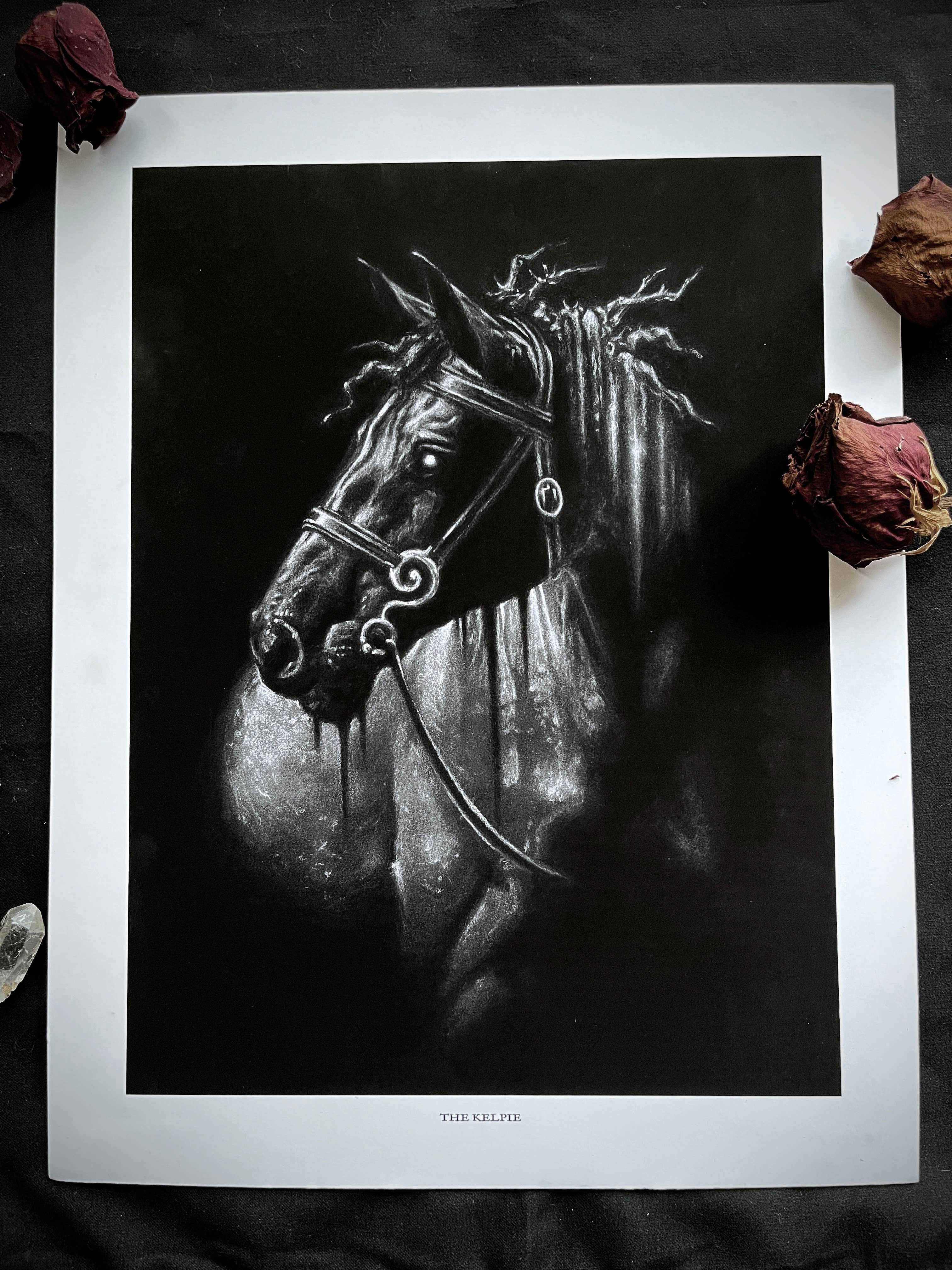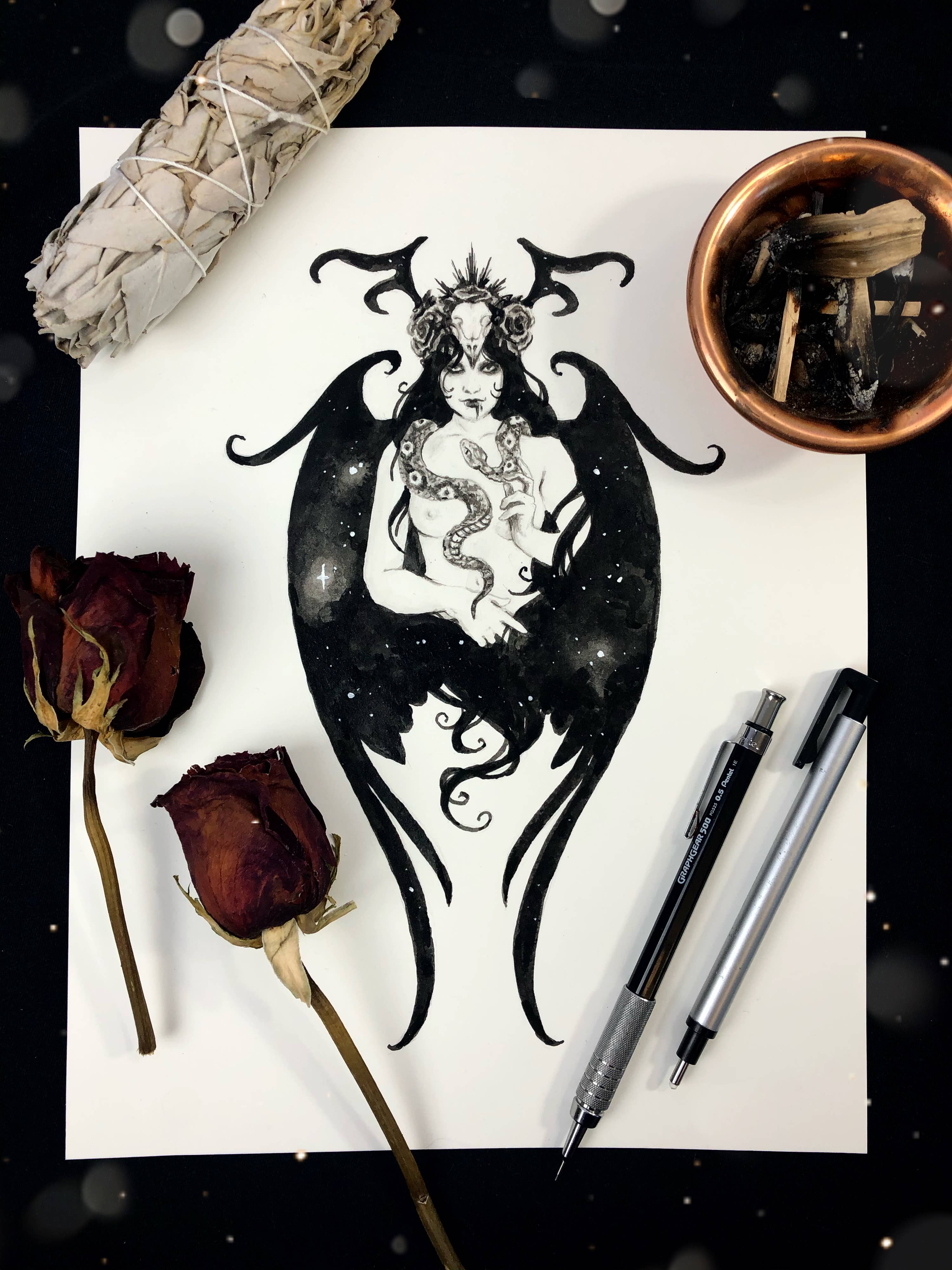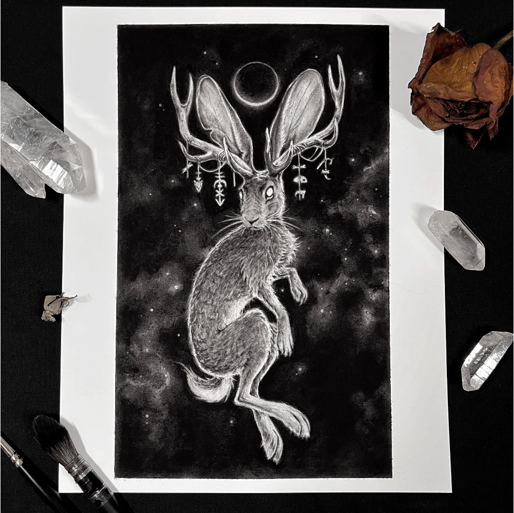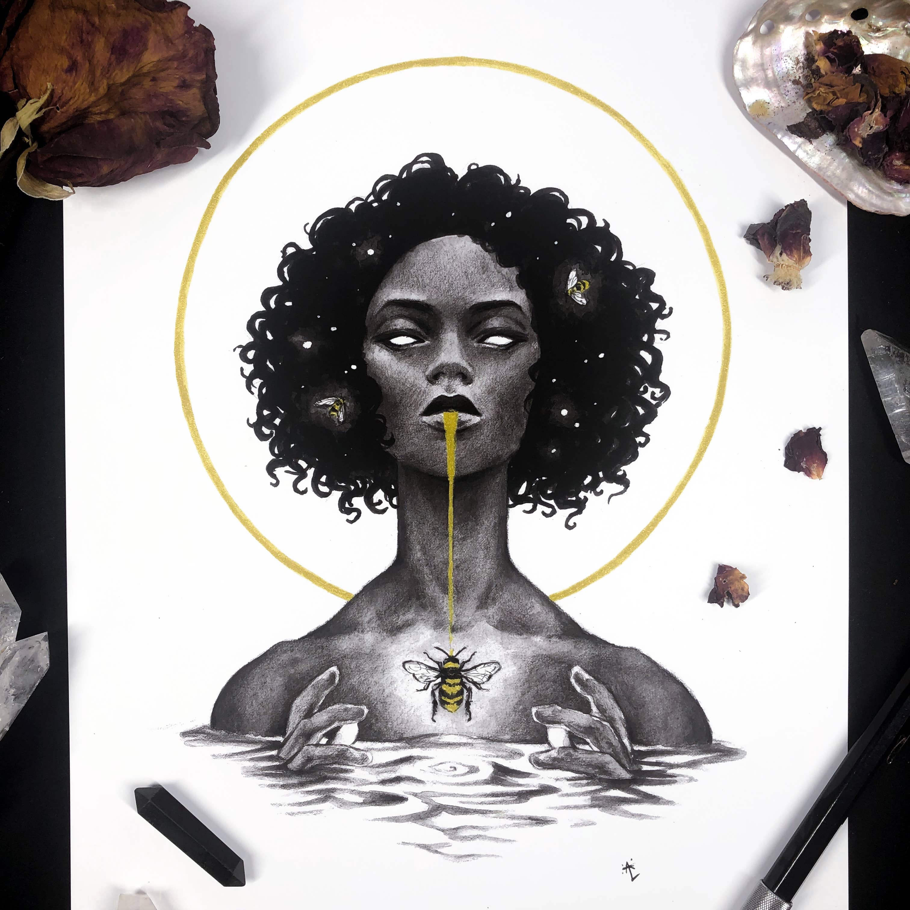 Annabelle Lewis is best known for weaving monochromatic palettes with gold leaf to illustrate a smorgasbord of interests: nature, history, mythology, and the occult. Each piece has a story to tell, and is meant to pull the viewer into a mysterious world full of macabre creatures and beautiful - but fearsome - goddesses. She is based in Austin, TX, where you're most likely to find her chasing after snakes and lizards or foraging for interesting bones.