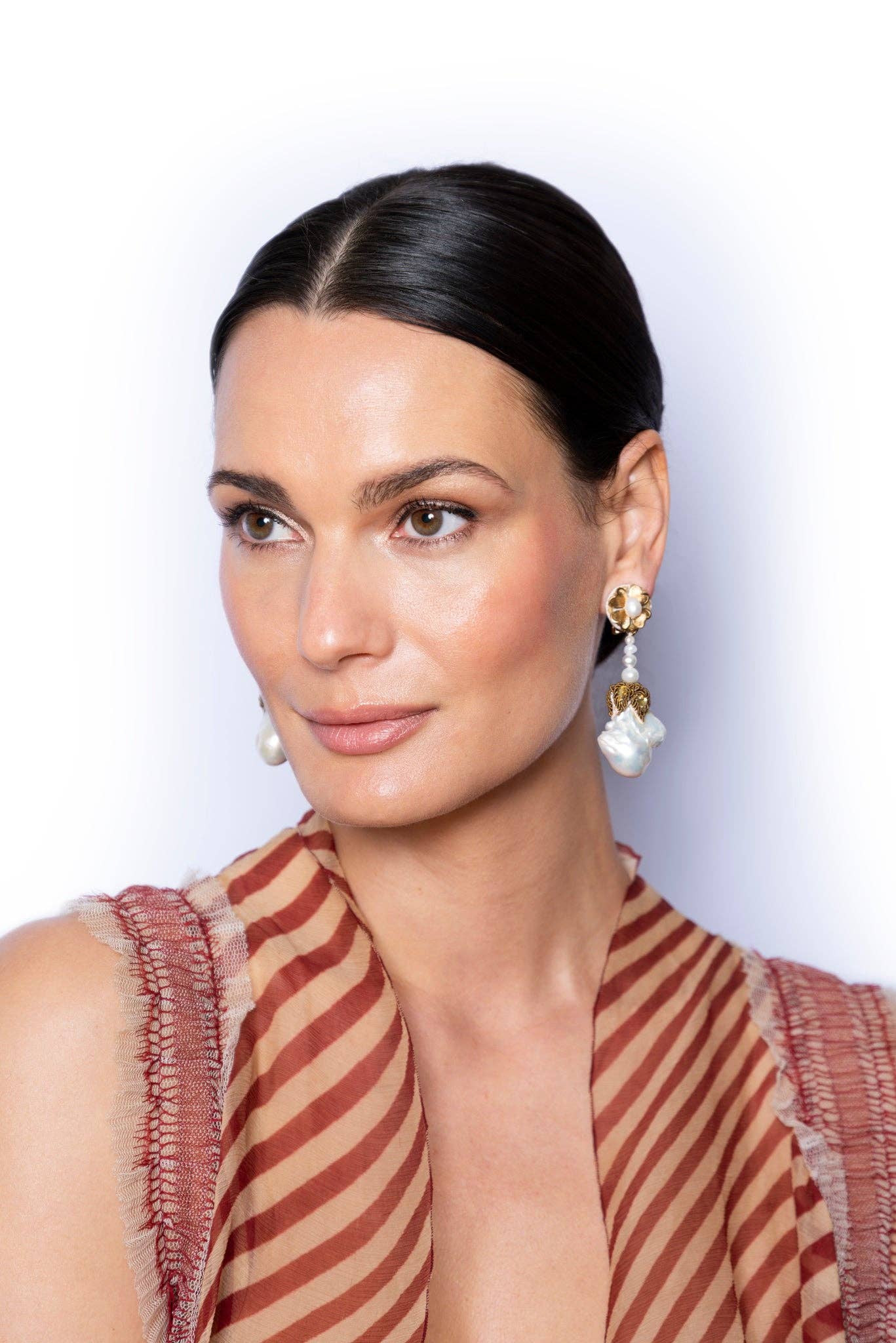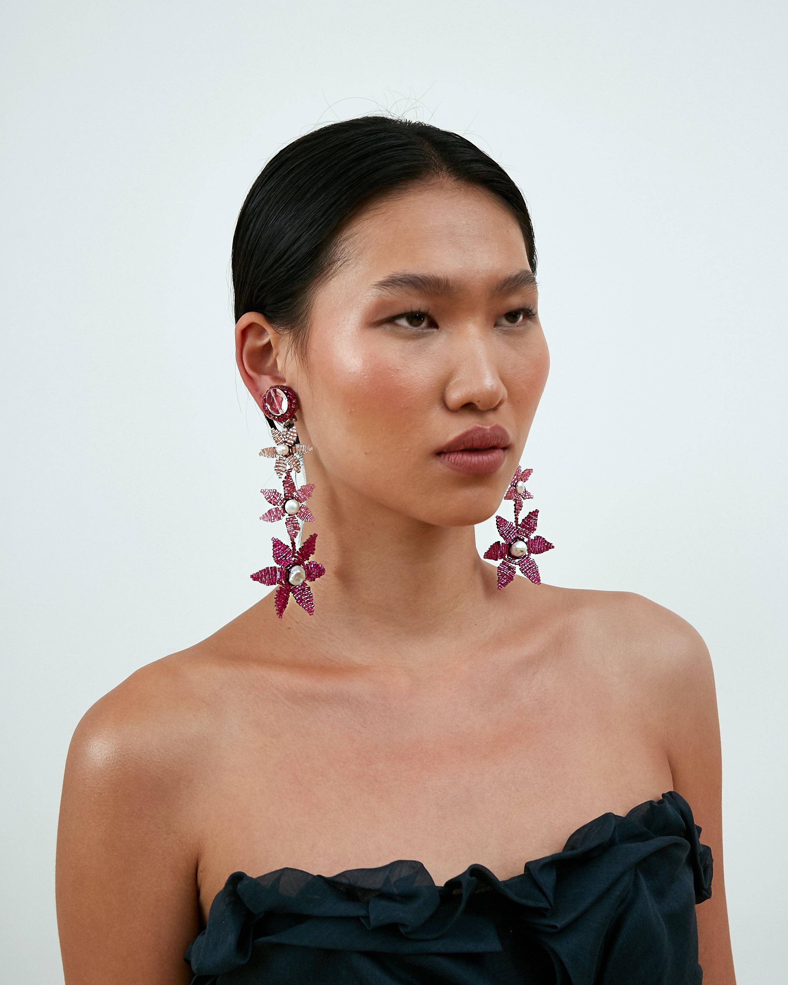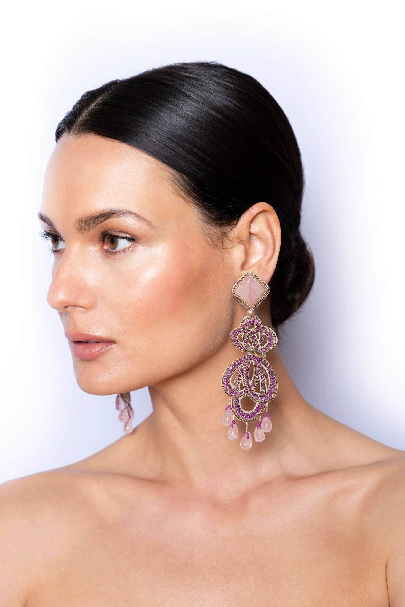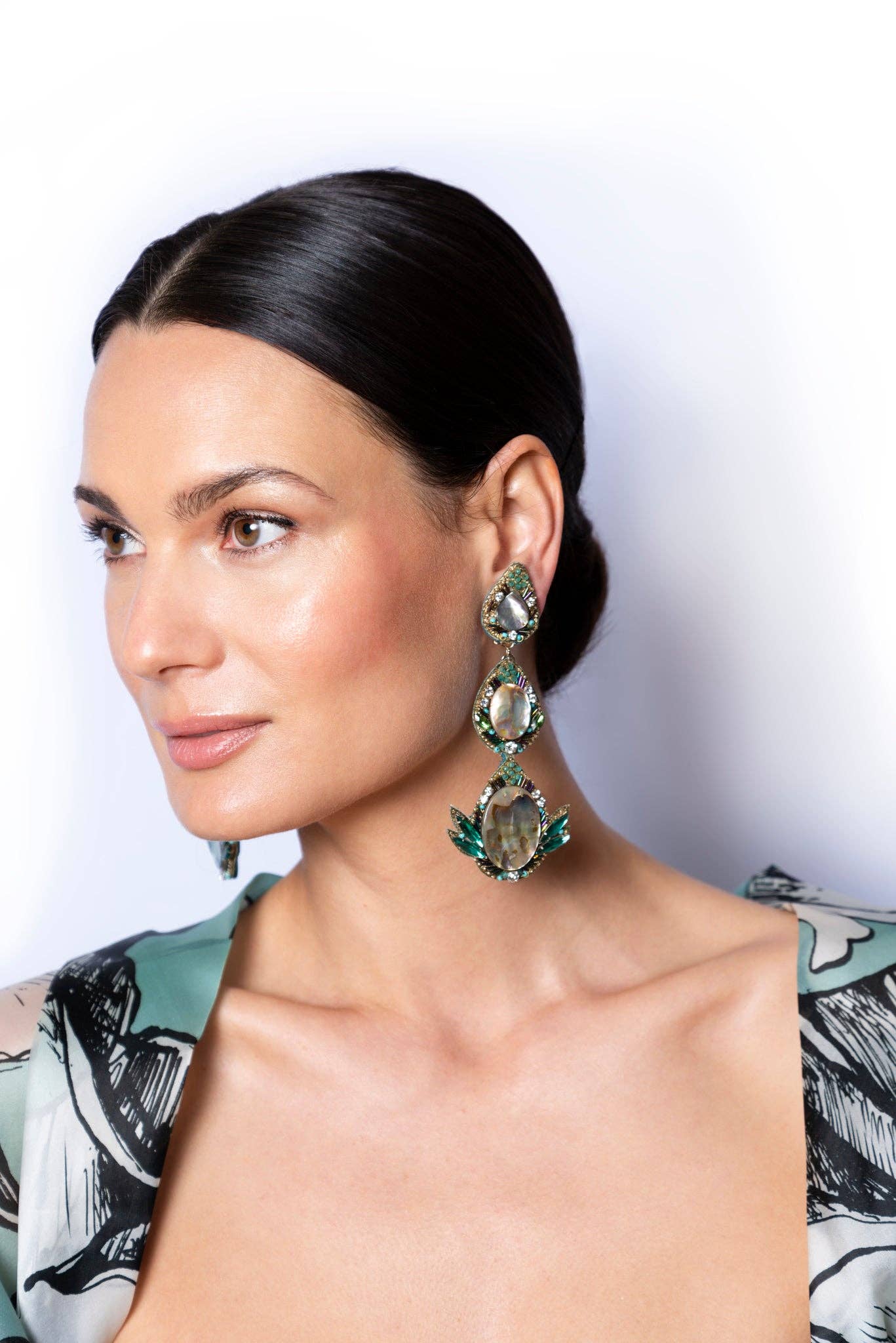 Ranjana Khan (RK) started her jewelry brand in 2008 after over two decades of work in the couture fashion industry. RK owned and operated Phoenix Hand Embroidery, a bespoke embroidery business, catering to Alexander McQueen, Jean Paul Gaultier Couture, Valentino, Jil Sander and Armani Privé, among others. She also collaborated with Lanvin to create the iconic tulle-wrapped pearl necklaces that were seen all over the runway. RK earrings are a mix of soft and hard materials, of organic shapes and some negative space. These earrings emphasize natural materials such as baroque pearls, spiraling shells, soft feathers, and iridescent beetle wings, to which other components such as vintage beads, Swarovski crystals, or semi-precious stones are added. Ranjana Khan jewelry is made to stand out. Our clients desire unique pieces, whether for an important event or casual daily wear. The earrings are decorated with an eclectic assortment of materials that are designed to stay light, while creating dynamic movement on the ear. There is a story behind each style. Some materials are found on Khan’s travels to exotic destinations, some are selected from vintage inventory, and deadstock. Because we upcycle a lot of what we use, some jewelry styles are only offered until that particular rare material has been entirely used. In the end, the designs are bold and whimsical—unconventional, yet classically beautiful. RK has gone from couture, to hand-made jewelry, and has expanded into the home