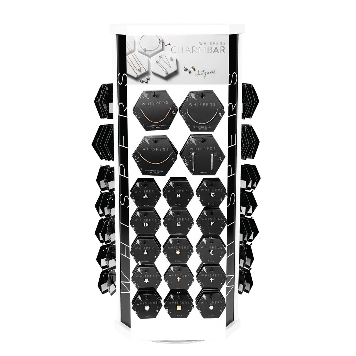 All Whispers earrings are under $5 and are hypoallergenic. This fashionable program offers exceptional margins and a small retail footprint. Designed with a completely planogrammed display with you in mind for convenient stocking and quick reordering. The optional custom display only takes 1 square foot of retail space, with the ability to earn up to $9K+ annually. CHARM BAR COLLECTION Whispers charm bar collection raises the bar on personalization. Creating that perfect gift has never been easier or prettier with Whispers Charm Bar. Metal charms and your choice of necklaces, bracelets and earrings all beautifully carded and ready to sell on a brilliant spinner display. Small footprint; big sales! Interested in learning more? Book an appointment here: https://www.jotform.com/form/241754493736163