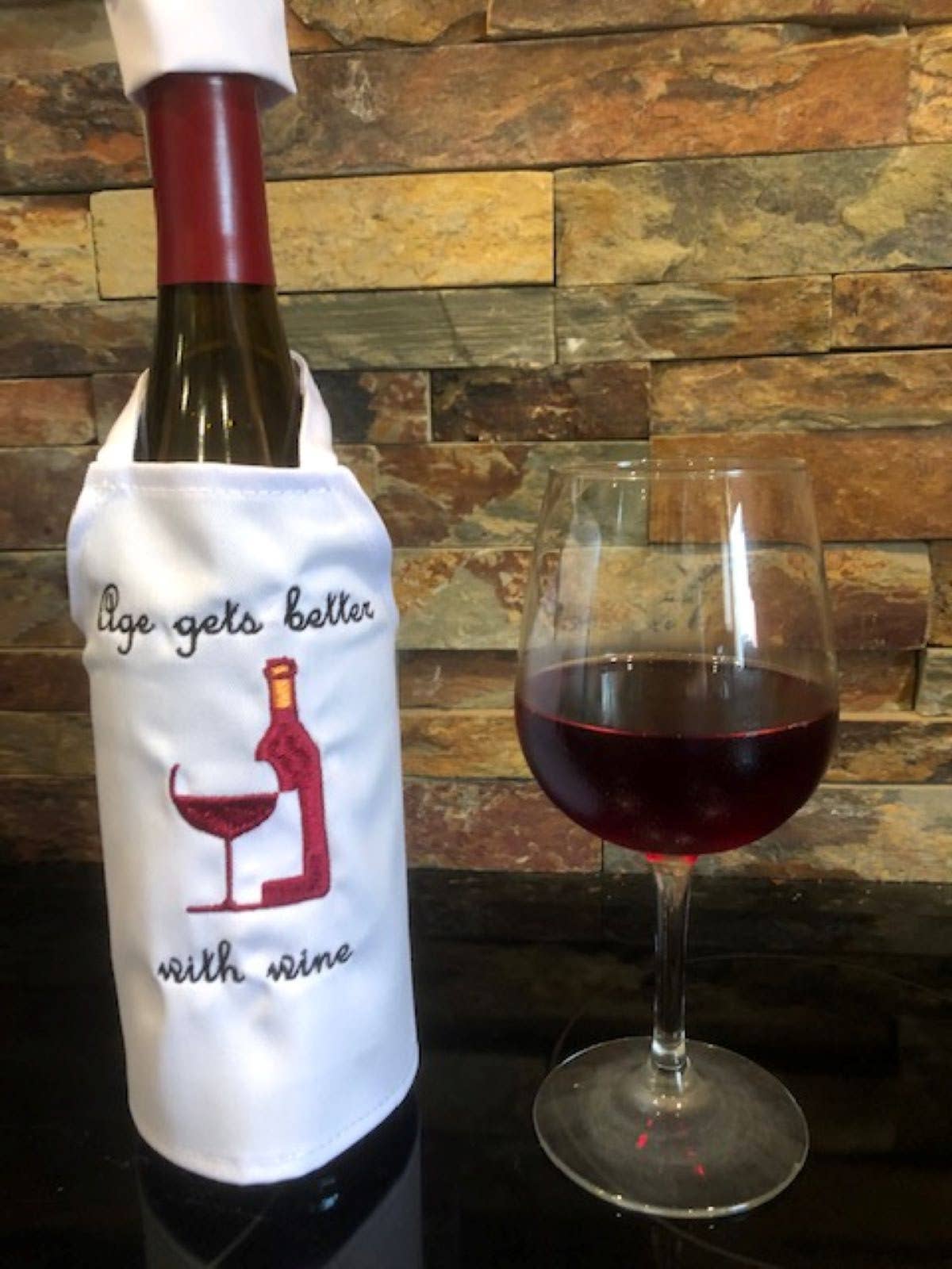 Julie and Lisa love to stitch. We would sit around in the evening with our mother, sharing ideas over a glass of wine. These wine bottle aprons are the perfect gift, great party decoration, and a unique touch to add to a celebration with family and friends. They are staple products of All Aboard Embroidery and we think you will love our fresh, creative designs.