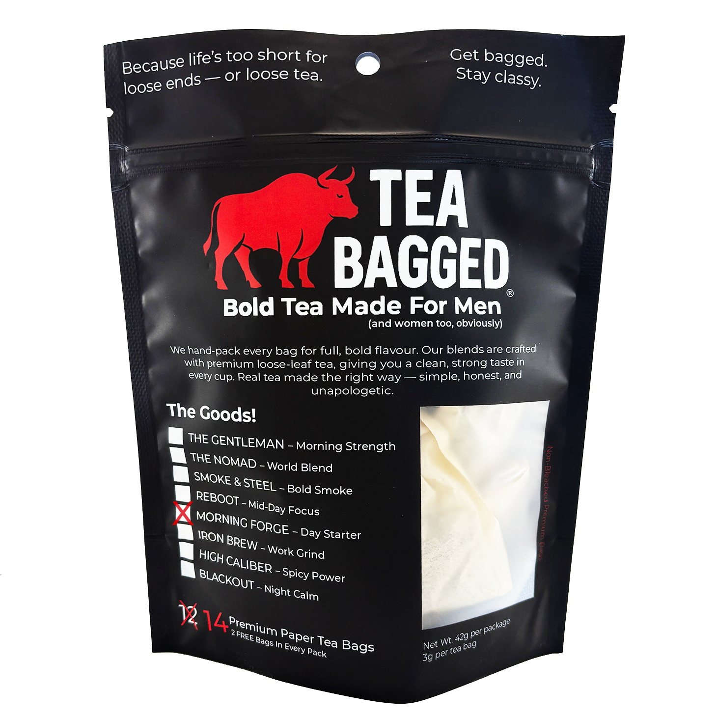 Tea Bagged, Bold Tea Co. was created to redefine men's tea by delivering bold, functional blends built for real daily routines. Instead of delicate flavours and wellness fluff, our teas are engineered for performance — strong morning energy, clean mid-day clarity, and deep nighttime calm. Every blend is formulated with purpose and packaged in premium tea bags for consistency, speed, and convenience. Our brand stands out because we focus on an underserved market: men who want stronger flavours, cleaner energy, and a simple, reliable ritual. From powerful black teas to smoky blends and calming evening brews, Tea Bagged offers a full system that resonates instantly on shelves. Retailers consistently see fast sell-through, strong margins, and repeat buyers thanks to our bold aesthetic and straightforward, benefit-driven identity. Tea Bagged, Bold Tea Co. is built on discipline, intention, and premium flavour — a modern tea brand designed to cut through the noise. With masculine packaging, strong storytelling, and blends crafted for real-world routines, we offer retailers a category-defining product that attracts attention and converts. This is tea made for men, built for daily use, and crafted to elevate every part of the day.
