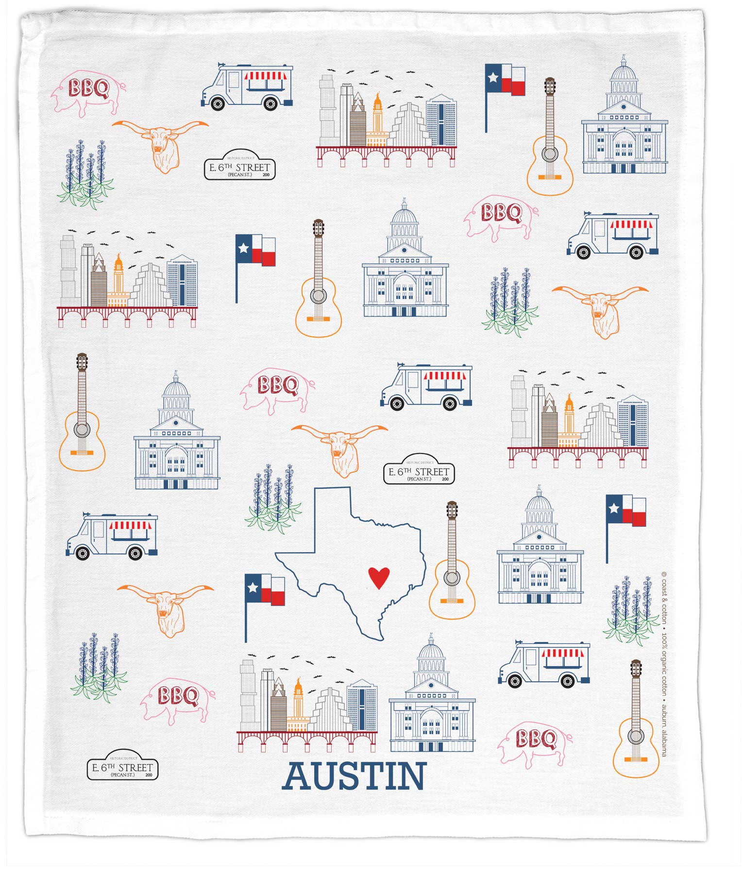 Sydney & Will Hewitt started Coast & Cotton in 2015 after ten years of moving and traveling with the military. Crafted with care and made to last, Coast & Cotton towels tell stories of meaningful moments and everyday joys. Headquartered in Auburn, Alabama, each towel is designed, printed, and wrapped by Sydney, Will, and their team of local college students. Coast & Cotton towels are made from soft, absorbent, 100% GOTS certified organic cotton. Each towel measures 21" by 27" and is printed edge to edge with colorfast, water-based dyes. Every design is hand drawn and lovingly wrapped with a coordinating grosgrain ribbon and kraft tag. Coast & Cotton towels are made to be well-loved and enjoyed for years to come.