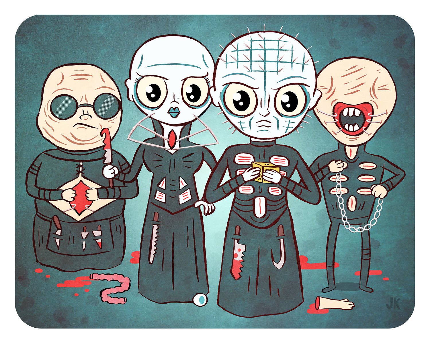 Jellykoe started in 2009, when I (Kelly) made a couple stuffed animals for my nieces. Spencer encouraged me to make more, and we came up with several fun creature designs. In 2010, Spencer decided to not only help design the plush, but to bring his imagination to life through illustration. Being toy collectors ourselves, we both knew from the beginning that we wanted our work to appeal more to adult collectors than children, but we didn't want to lose the whimsy in them. So we kept the bright, fun colors but mixed it with horror or dark themes. We like to call our style "creepy cute."