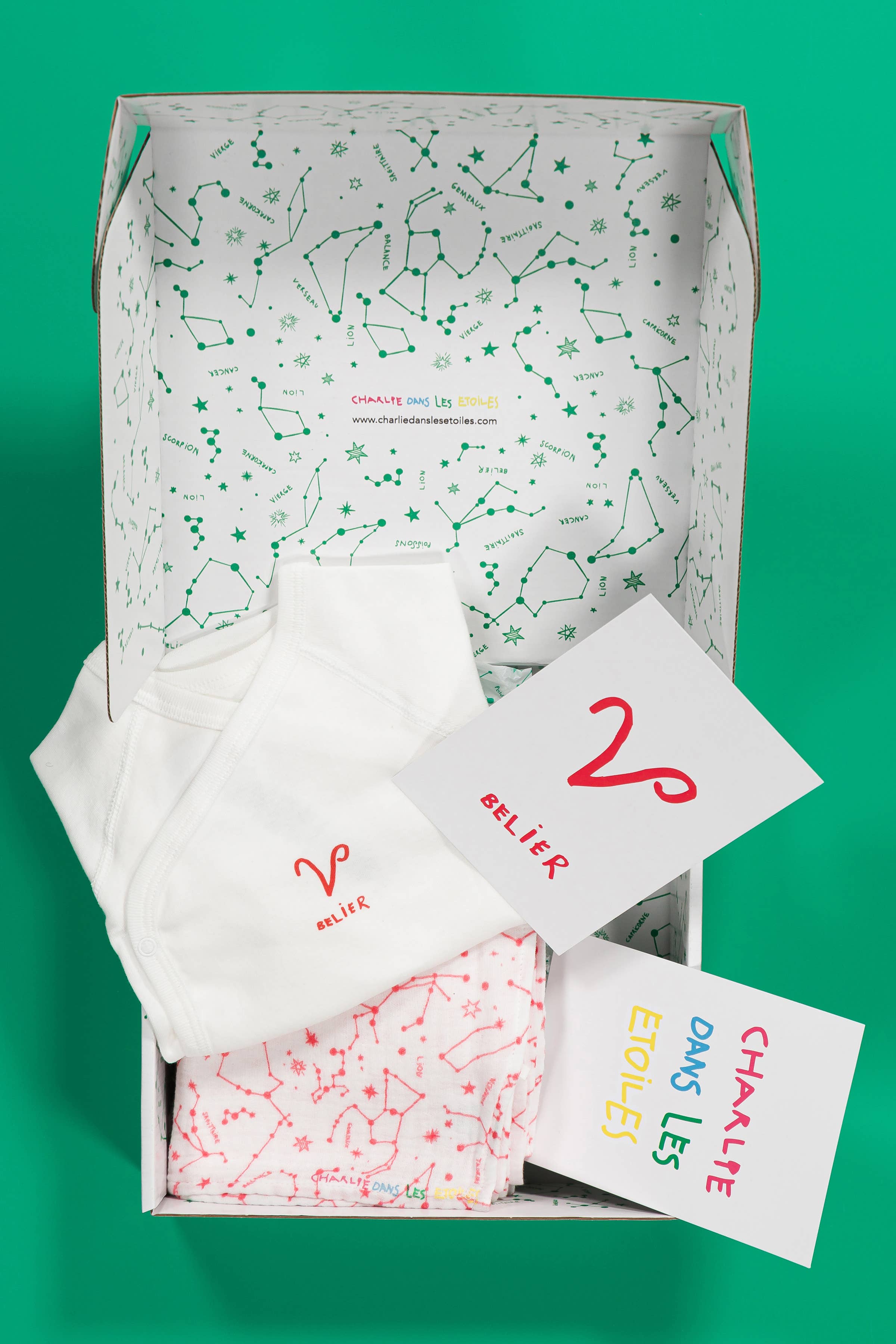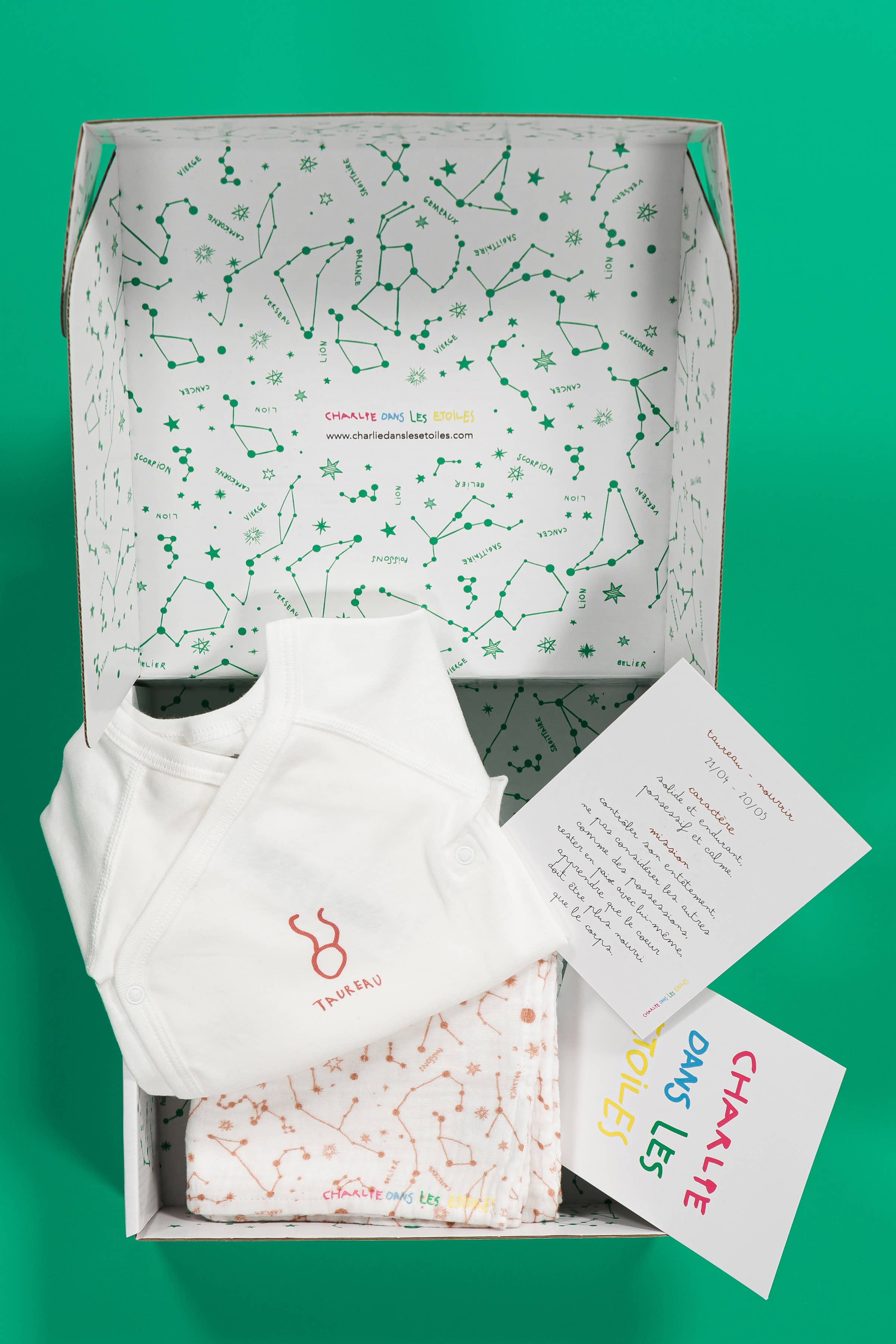 One day Charlie started talking about planets! “Mom what's astrology? I know that we live on Earth, that Mars is red, but my favorite is Venus because it shines because of the Sun and that's beauty too”! This is how Charlie and his mom, both born under the sign of Libra, go on a mission... it will be Charlie in the stars! This four-handed project will see the light of day a few months later, Charlie 5 years old will be at the origin of all the designs! A textile line in organic cotton 100% Made in France screen-printed with astrological tone, a birth box (bodysuits, swaddles & bibs), a girls' box (tank top and pants), a boys' box (t-shirt, boxer), a game of astrology initiation cards for children, a surprise bag filled with goodies (coloring book, stickers, tattoos, planetary felt-tip pens), a Tatoos box with 12 astrological signs (allergen-free, meeting French cosmetic standards), all created by a child for children, Welcome to the playful and colorful universe of Charlie in the stars!