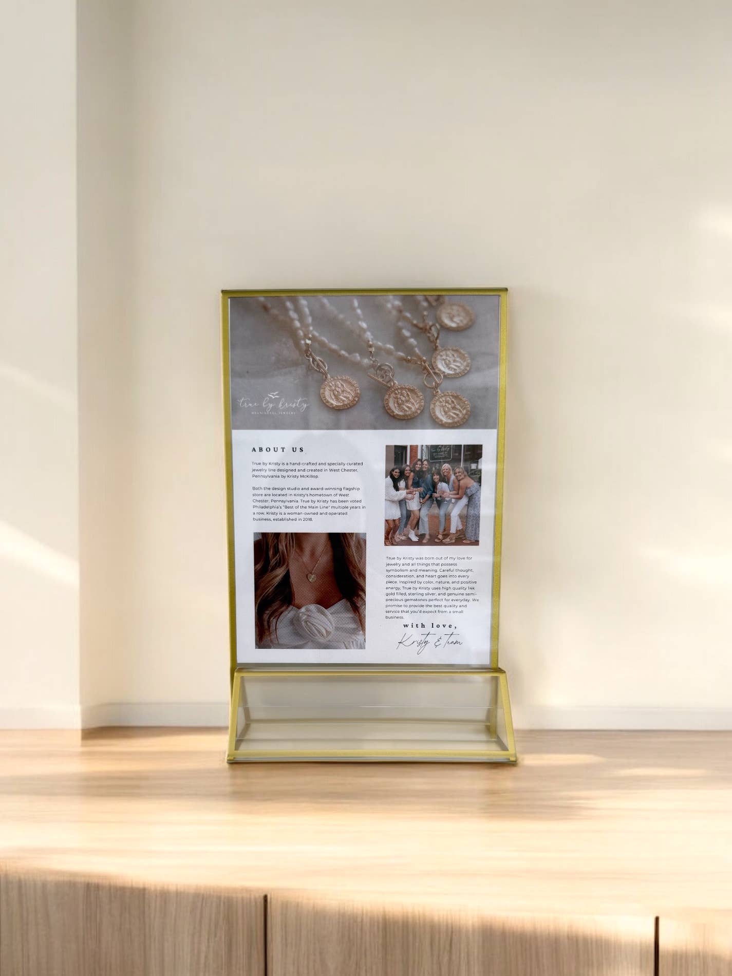 True by Kristy is a hand-crafted & specially curated jewelry line designed and created in West Chester, PA by Kristy McKillop. True by Kristy was born out of my love for jewelry and all things that possess symbolism and meaning. Careful thought, consideration, and heart goes into every piece. Inspired by color, nature, and positive energy, True by Kristy uses high quality 14k gold-filled, sterling silver, and genuine semi-precious gemstones perfect for everyday. We promise to provide the best quality and service that you’d expect from a small business. Please message us should you have any questions. Thank you, we appreciate the love. - Kristy and the TBK team Both the design studio and award-winning flagship store of TBK are located in Kristy's hometown of West Chester, PA. TBK flagship store located in historic downtown West Chester, PA, opened in November 2023. True by Kristy has been voted Philadelphia’s “Best of the Main Line" in multiple years in a row. True by Kristy is a woman-owned and operated business, established in 2018.