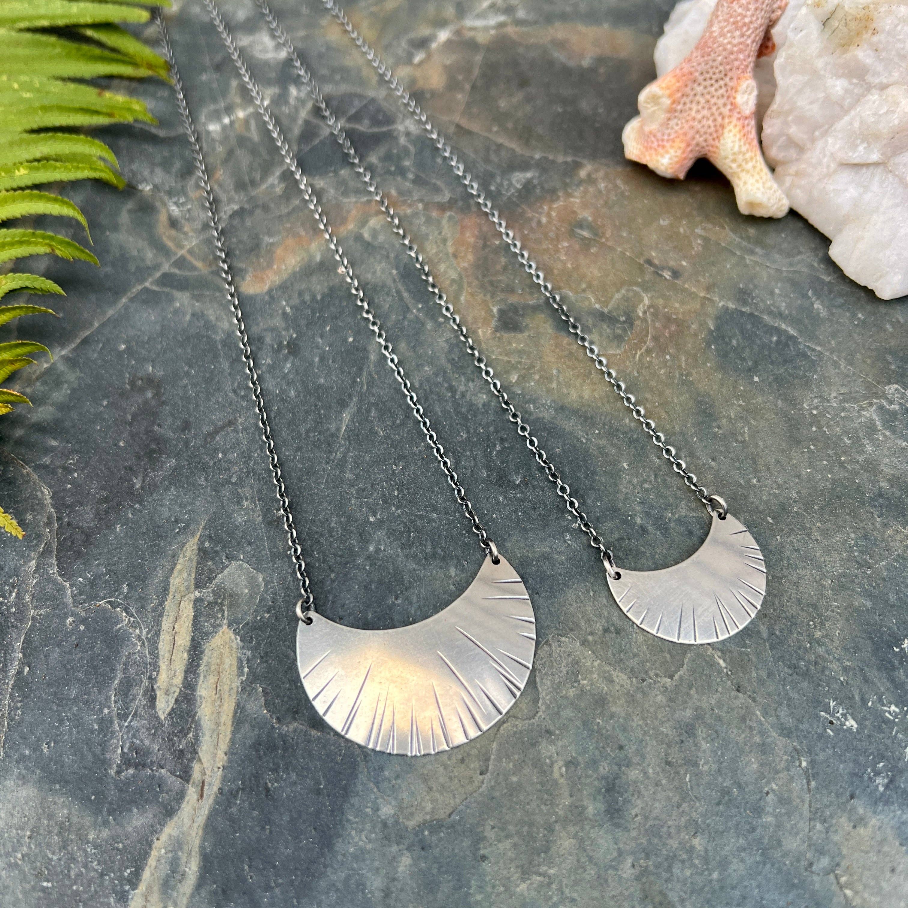 All Midnight Pacific Jewelry is hand-fabricated at my home studio in Garibaldi Oregon. I use sterling silver, brass, gold, beach stones and gemstones in my designs. Hand-hammered textures and mixed metals are used to highlight the fabrication process, and emphasize the careful details of craftsmanship. Inspiration is drawn from natural landscapes and textures, as well as ancient cultures and designs.