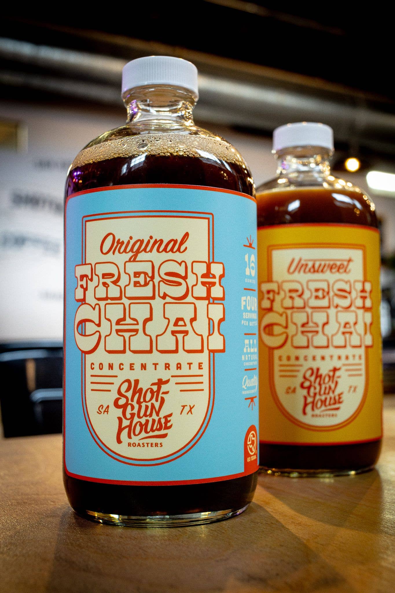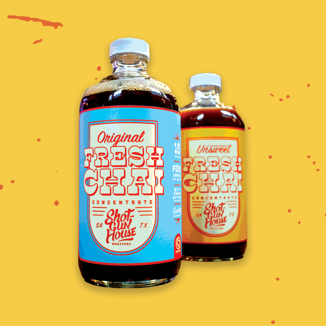 Shotgun House Roasters started in 2017 when founders Eddie Laughlin & Jessica Callery started roasting 1lb batches of coffee on the front porch of their San Antonio Shotgun House. They began popping up on the weekends, selling bags of coffee and cups to passersby. As their popularity grew, they quickly realized they needed a larger roasting space and set their sights on Warehouse 5, a multi-suite creative space in downtown San Antonio. They built it into a full service coffee shop and roastery and have roasted there since early 2018. Shotgun's first retail staple has always been freshly roasted coffee (in fact our slogan is Drink Fresh Coffee), and we proudly serve the San Antonio/Austin communities as well as larger regional and national grocers such as Whole Foods, Thom's Market, and Fresh Plus Grocery. Our newest product and one we believe has a ton of potential is our 16oz Fresh Chai Concentrate bottles. Our Fresh Chai Concentrate is made entirely from scratch with all natural ingredients, including fresh ginger, whole spices, and pure cane sugar. Each 16oz bottle contains 4 servings and is available in Original (sweet) or Unsweet. Simply add your milk of choice and serve iced or warm on stove. Cheers!