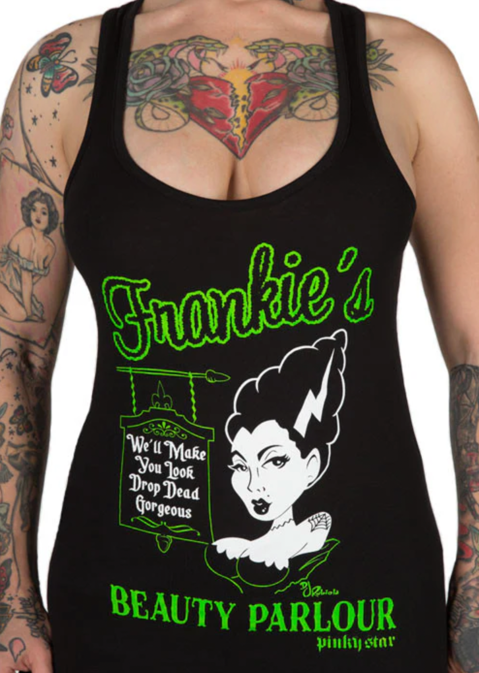 Pinky Star is female owned women’s Tattoo lifestyle brand, designed in Los Angeles. Everything is printed in the USA. Bodies include T-shirts, tanks, shorts, cardigans, and more. The fit is form fitting, and sizes generally range from S-3X.