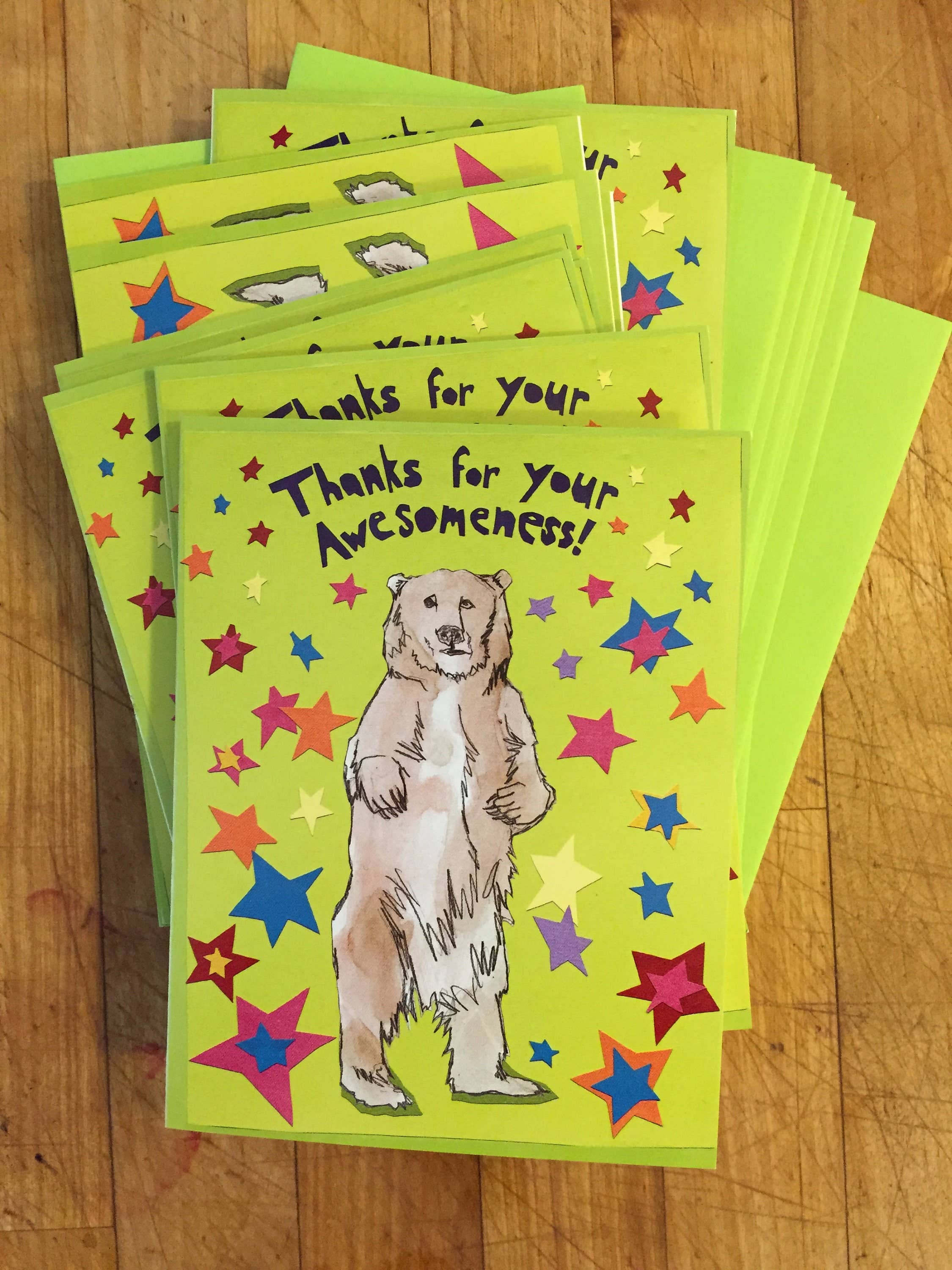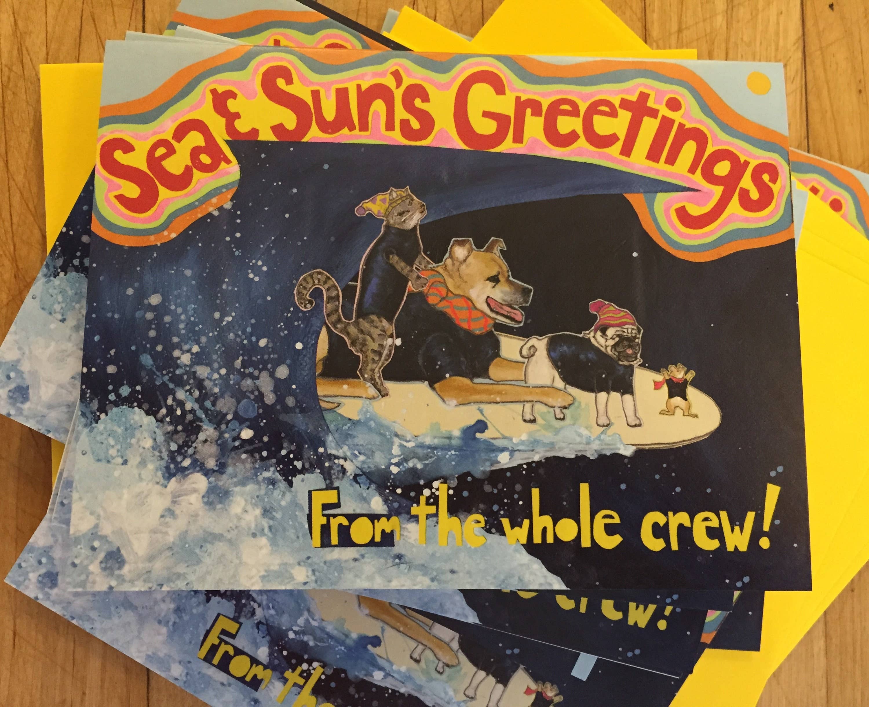 Sunde is a San Francisco artist that makes all her art for her products by hand. Her mixed media collage technique that is scanned and then printed on an offset printer creates cards and products that are saturated in color and textures. Her product line includes individual cards, boxed cards, coloring books, stickers and other products. She both writes and illustrates her books and cards and humor is her specialty. Sunde gets inspired by her dogs, surfing and being outside in the Bay Area. She owns her own gift shop in Pacifica, CA.
