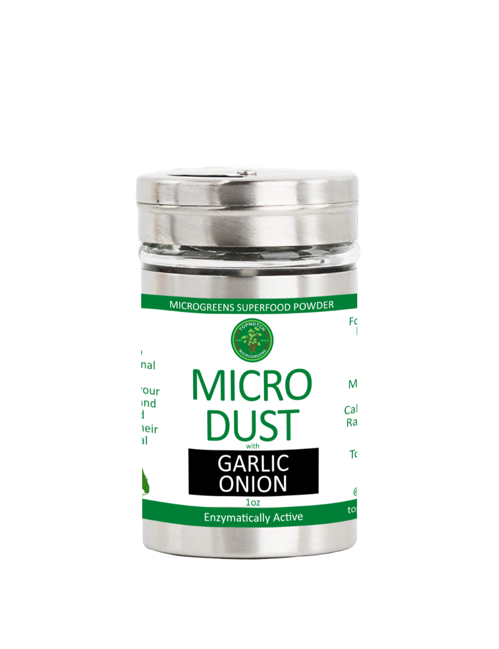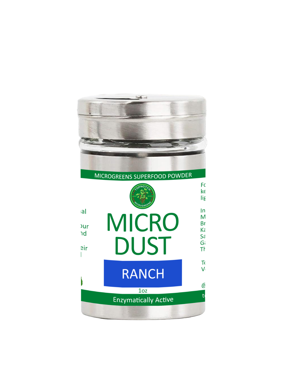 TopNotch Microgreens, Our MicroDust Story At TopNotch Microgreens, we set out to make superfood nutrition effortless, and that mission led to the creation of MicroDust, our vibrant line of concentrated microgreen seasonings. Each blend begins with six powerhouse microgreens: Broccoli, Brussels Sprouts, Red Cabbage, Kale, Mustard, and Radish. Grown using heirloom, non-GMO seeds and organic methods, our greens are harvested at peak vitality, gently dehydrated, and turned into a fine, nutrient-rich powder that adds flavor and nourishment to any meal. MicroDust was created for customers who want clean, high-impact nutrition without changing the way they cook. Just a sprinkle boosts dishes with vitamins, antioxidants, and natural plant power. From bold flavors like Cheezy, Umami Mushroom, Garlic Onion, Ginger Turmeric, Ranch, Taco, and our Super 6 blend, each one brings a fresh, nutritious twist to everyday foods. MicroDust is small, mighty, and designed for modern living. A simple way to elevate meals, support wellness, and enjoy the pure goodness of microgreens in every bite.