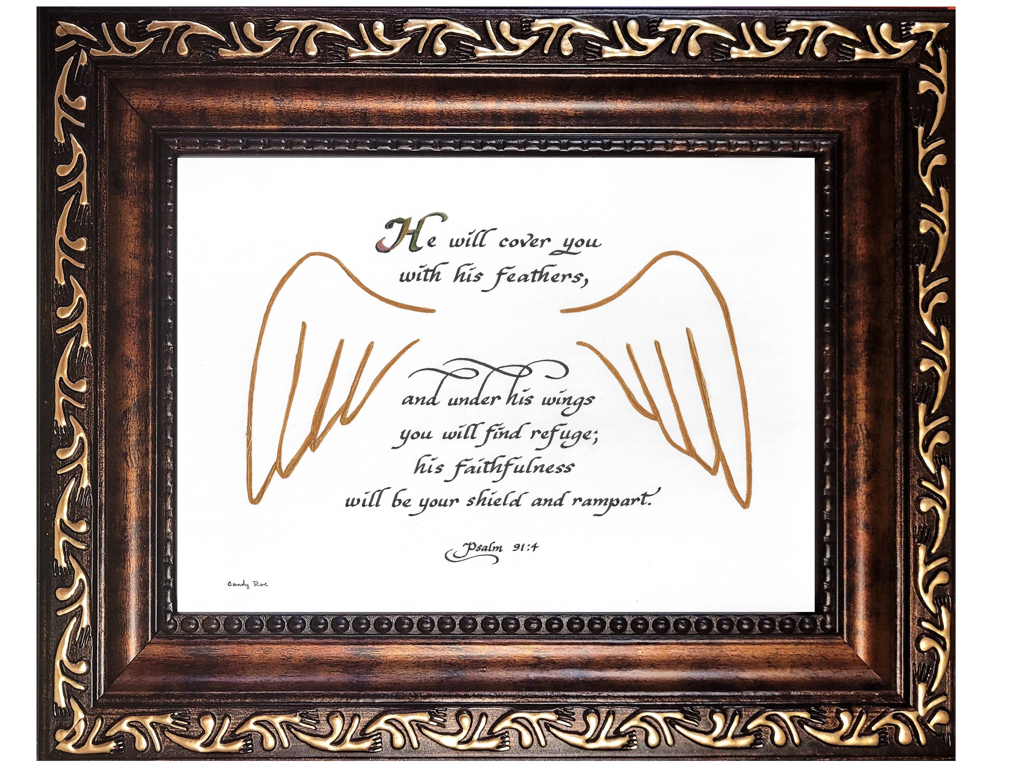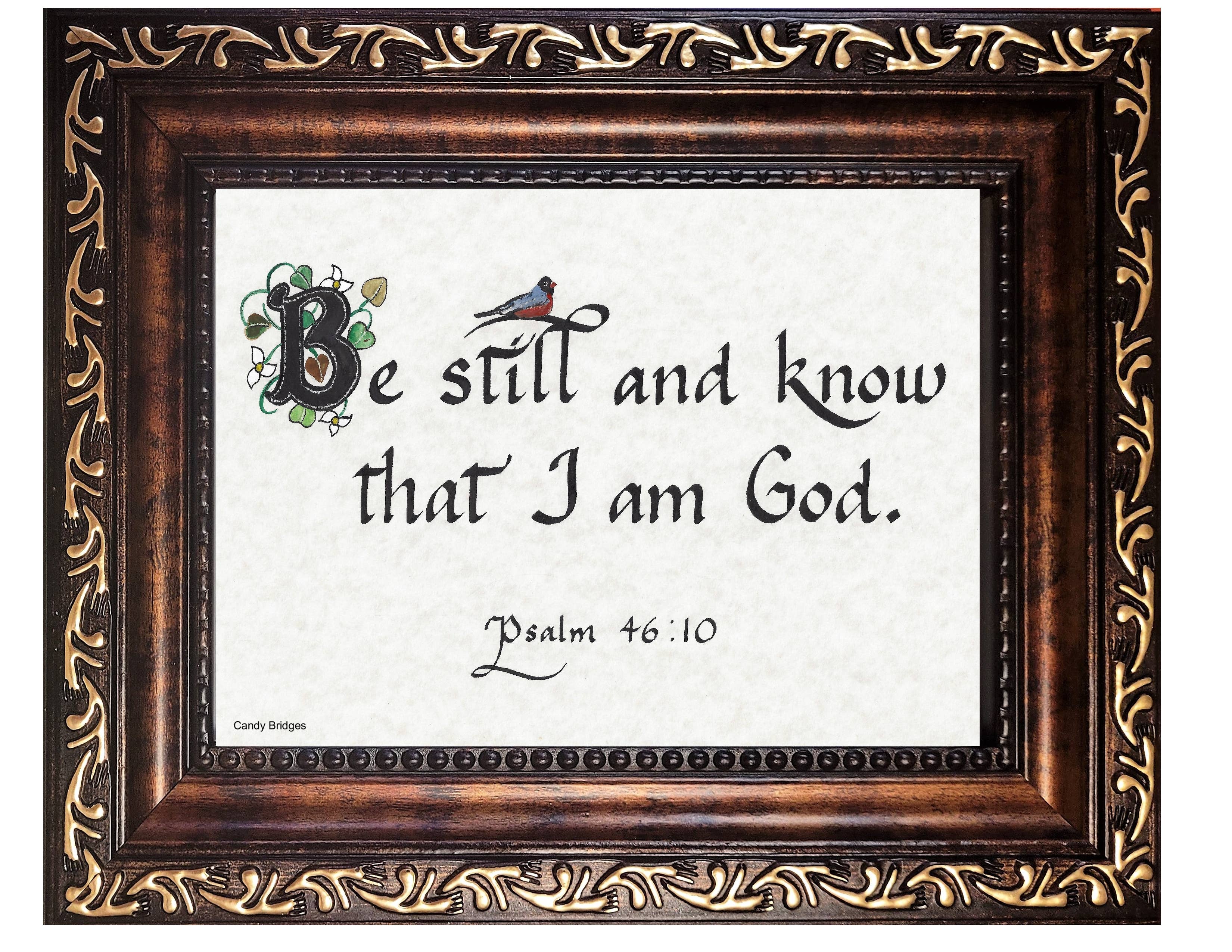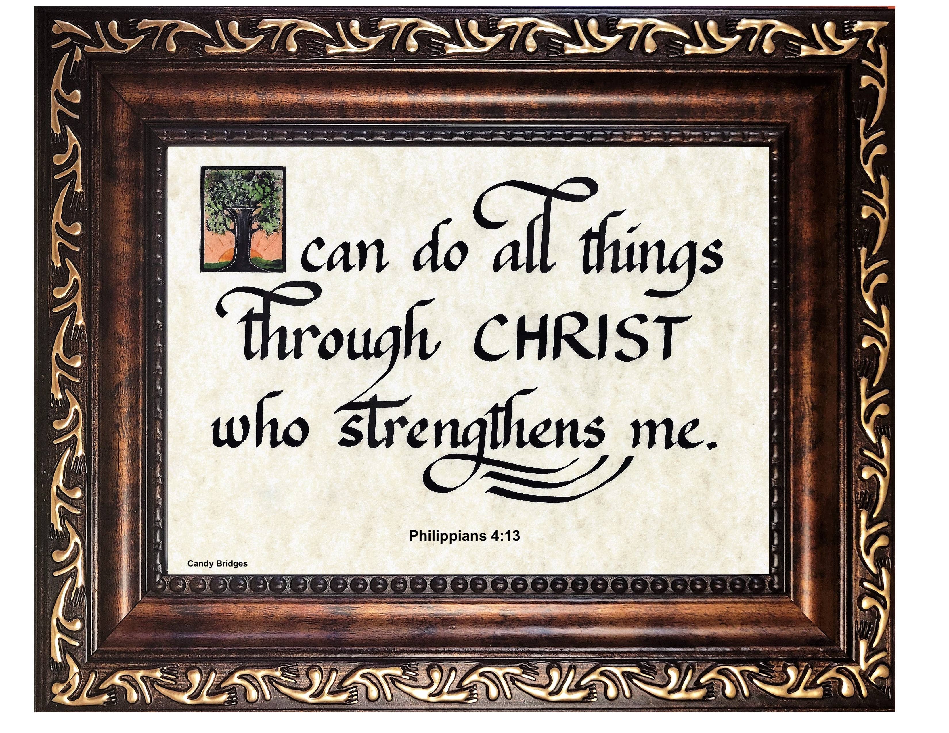 Hello. My name is Candy Bridges and I am a calligraphy artist, picture framer, and creator of Inspirational and Scriptural sentiments and verses. My Christian faith moves me to create art and calligraphy that uplifts, inspires, and reminds the reader of their own faith. Over the past 35 years, I have enjoyed creating a line of art and calligraphy prints and now offer them to you for your customers. In today's world, we often need inspiration and hope-filled reminders of our faith.