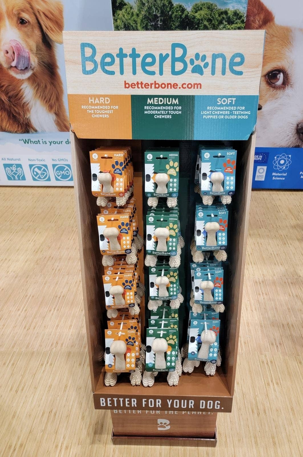 BetterBone: A Brand Tailored for Dogs and the Planet At BetterBone, our mission is simple: Better for your dog. Better for the planet. Inspired by our deep love for dogs and our commitment to sustainability, we set out to revolutionize the world of dog chews. Dogs deserve the best, yet traditional chews often fall short, made from materials like petroleum-based nylon, chemical-laden rawhides, rubber, and ropes. These options can pose dental and health risks, conflicting with our desire to provide the best for our pets. BetterBone was born from the belief that there had to be a safer, healthier, and more sustainable way to satisfy dogs' natural chewing instincts. Armed with over 25 years of expertise in material science, we developed a proprietary blend of all-natural, GMO-free cellulose and vegetable oils sourced from the European food industry. This innovative material forms the foundation of BetterBone chews, ensuring they are safe, sustainable, and satisfying for dogs of all sizes and breeds. BetterBone chews come in three densities: Soft, Medium, and Hard, catering to teething puppies, everyday chewers, and aggressive chewers. Recently, we introduced the BetterBone Mini, specifically designed for dogs under 15 to 20 lbs. Each chew is crafted to promote dental health, protect teeth, and provide a satisfying chewing experience. Our commitment to sustainability is unwavering. BetterBone is a carbon-neutral product. From production to packaging we are leading the industry