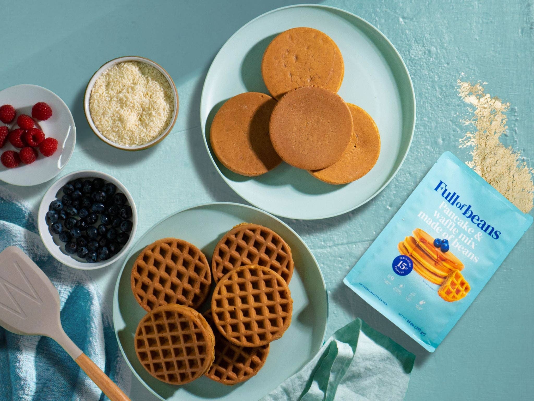 Full of Beans is the result of my intense passion for beans and the positive health benefits I experienced from eating them every day. However, after moving to the U.S., I struggled to incorporate them into my daily routine. This challenge prompted me to find simpler ways to enjoy them. At the same time, I noticed the limited and overly processed plant-based protein options available for breakfast. I learned that we are supposed to eat beans at least three times a day for the prebiotic and protein benefits they offer, which help with inflammation in the body—a crucial factor for me, as my family has struggled with autoimmune diseases my entire life. This sparked a question: How can I incorporate beans into breakfast? How about pancakes? AJ joined in; he improved his athletic performance by eating more beans, and together, we are on a mission to make beans a breakfast staple. Enjoy pancakes and waffles with the familiar flavor you know, but with the superpower of beans.