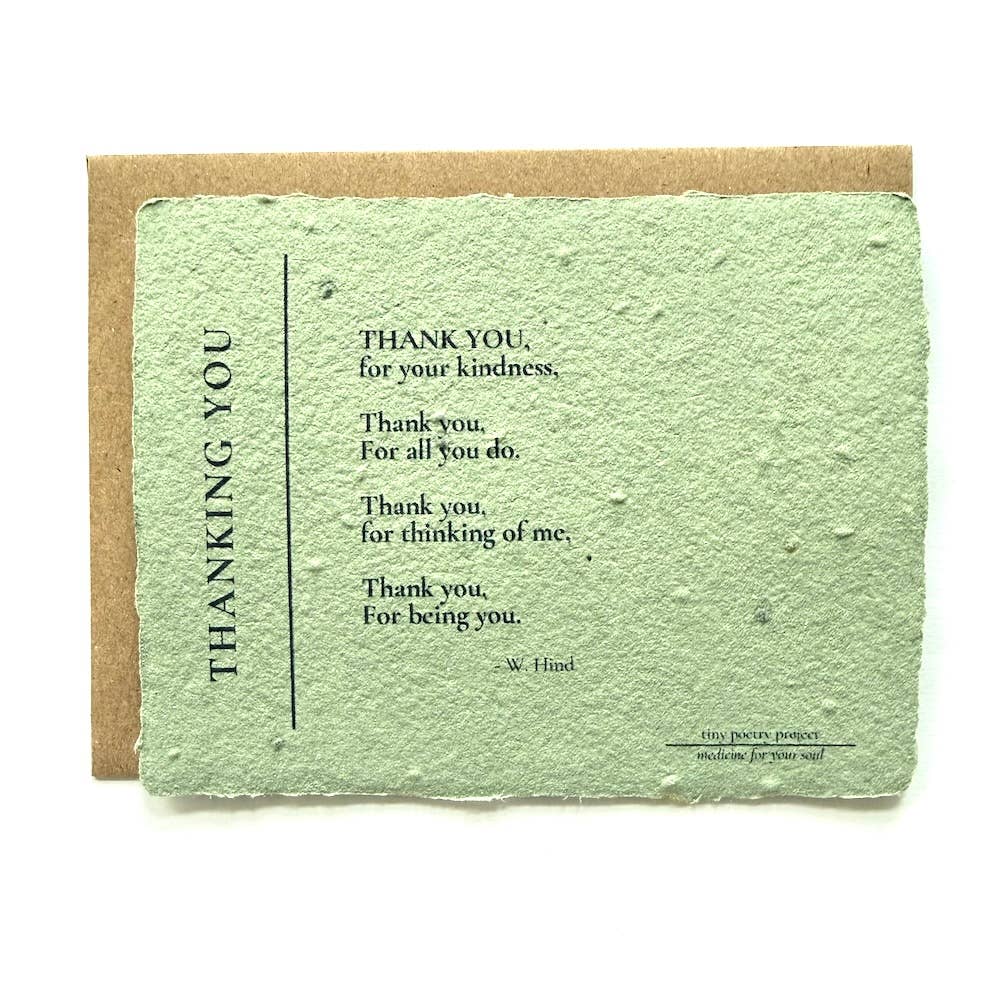 Welcome to the Tiny Poetry Project! Do you know someone who needs some medicine for their soul? The Tiny Poetry Project began growing when my son was born with a life-threatening heart condition. I started writing poetry (and getting published in medical journals) as a form of medicine for my soul. Now, twenty-three years later, as a former lawyer and professor, I've published quite a lot of poetry and give workshops about the benefits of narrative medicine. My tiny poems are designed to provide you and the recipient with strength, power, and courage. The mission of the tiny poetry project is to give not take. Each tiny poem is a gift to be meditated upon, shared, and then planted or framed. The artisan paper for the TPP Wilds Line is created from locally sourced recycled fibers and wildflower seeds. The TPP Origami Line is made with locally sourced recycled cotton fibers and embellished with beautiful handmade washi paper cranes or red hearts. All TPP cards are hand crafted so every card will be a bit imperfect - just like us. The envelopes are 100% recycled kraft paper and the clear sleeves are plant-based and compostable. Tiny Poetry Project cards are kind to our hearts and to the environment. Thank you for taking a few minutes to read some tiny poems. I hope they fill your soul and you will share them in your beautiful shop. *Orders outside of North America will be printed on beautiful recycled cotton paper (not seeded paper) due to import/export laws.