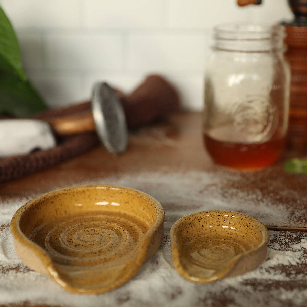 Hi, my name is Shelby Vanbuskirk. I am the owner and maker, Pantless Potter. I began creating functional pottery in the summer of 2019 during a college level ceramics class in Kansas City. I took this class while teaching elementary art in Raytown to expand my elementary art degree to K-12. I quickly fell in love with clay and the wheel and snowballed into making and selling. When starting out, I worked in the corner of the garage in my home and carried the kiln I'd purchased off Facebook Marketplace outside to fire nearly daily. Being the middle of summer in Missouri when all this started, it was hot and humid. Each day my husband would come home and see me working at the wheel and ask, "Are you even wearing pants?" to which I would laugh. Thus, the Pantless Potter was born. My work is designed to be for the home, functional, unique, and personal. Each piece is handcrafted from my home studio. My work is mostly hand built and wheel thrown, with the exception of my ornaments that are poured with porcelain in vintage molds. Handbuilt items are Gnomes, which have grown into what I am mainly known for. My Stoneware collection is made from high quality stoneware, all of which is food, dishwasher, and microwave safe. I fire my work in an electric kiln to cone 5 and 6. While I use a variety of glazing techniques to achieve my finished look, most every piece is brushed by hand. I hope you enjoy my work for many years to come and return soon!