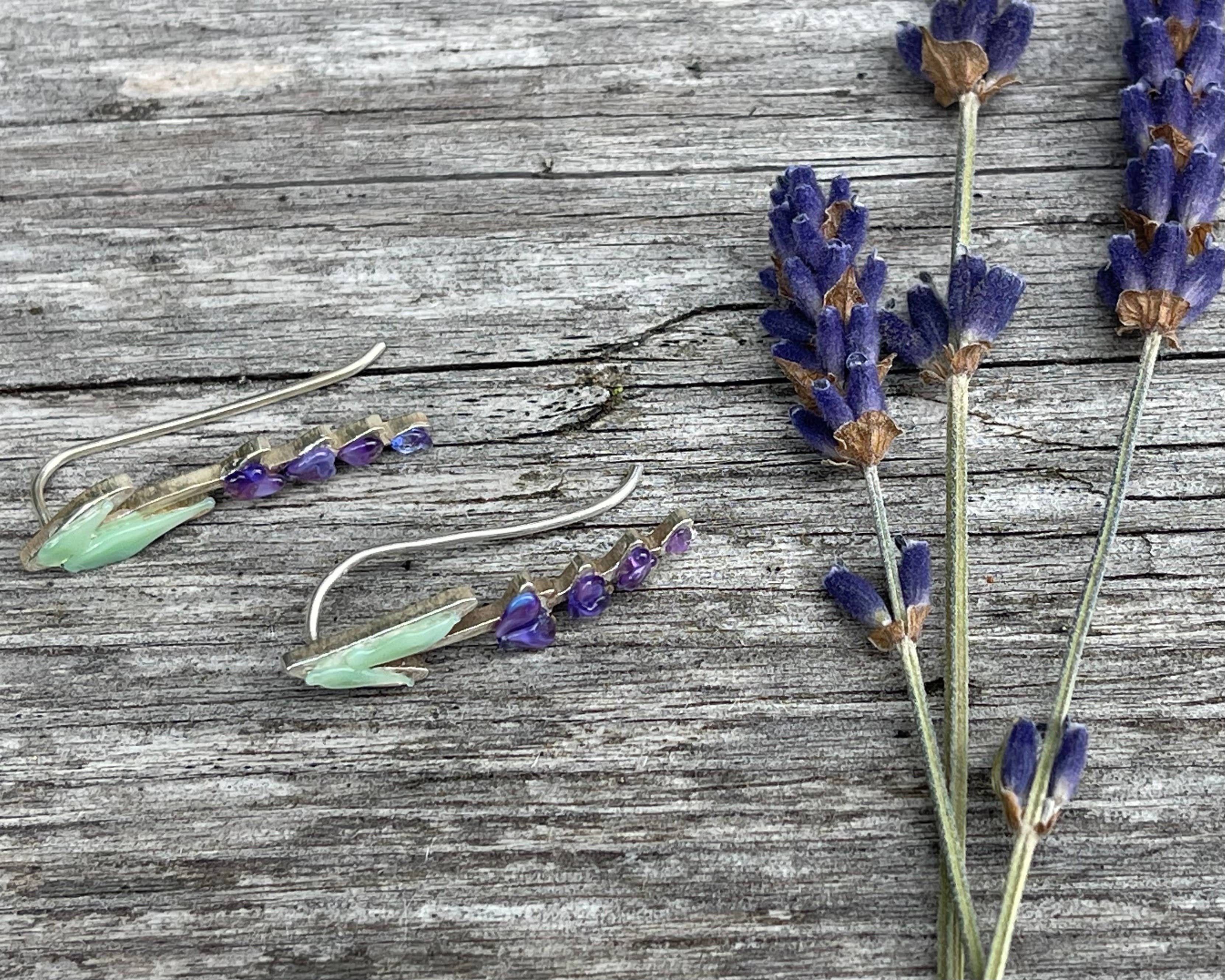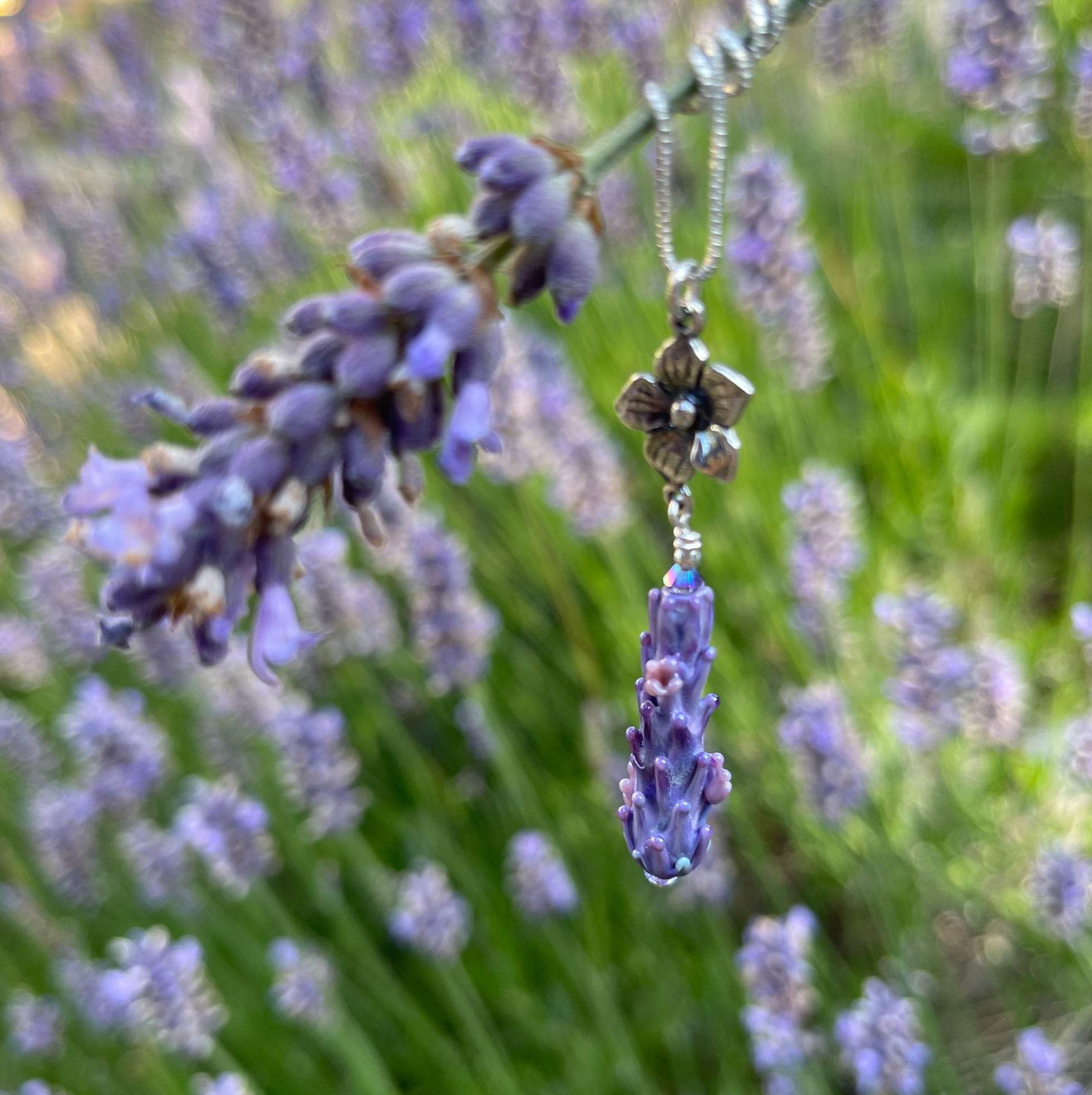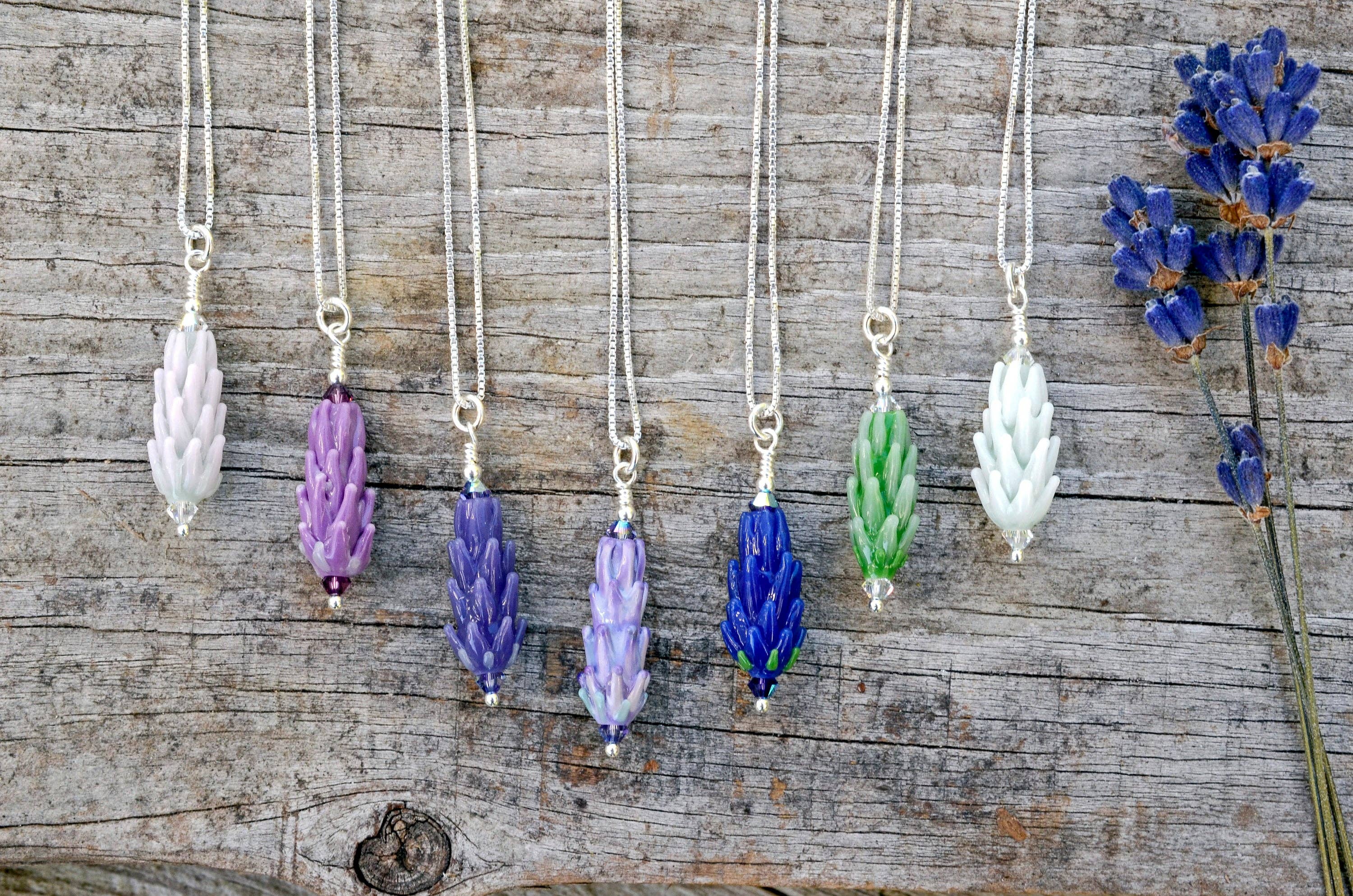 Andrea stands as the sole artisan behind Lavender Beads. Based in the beautiful San Juan Islands, nestled in the heart of the Pacific Northwest, she has been developing her torchwork methods for over 25 years. Fusing her passions for glasswork and lavender, she is inspired by the many unique varieties growing at the local organic farm where she has been employed for the past two decades developing value-added products from lavender flowers and essential oil. Andrea spends her days in her jewelry studio, crafting intricate, botanically accurate lavender blooms out of glass. Inspired by the varieties of the beloved local farm, she works to capture the essence of the form of the plant, from the first budding stage to full bloom. From there, she uses sterling silver findings and Swarovski Crystals to add glimmering final touches to pendants, bracelets, and earrings. Her bestselling gender-neutral Aromatherapy Bracelets use porous lava stones to soak up lavender essential oil, so you can carry the sweet herbal smell with you wherever you go. Each piece in the jewelry line not only serves as an accessory, but also a unique keepsake souvenir from a visit to a lavender shop or farm store. Find your next unique jewelry line here, at Lavender Beads!