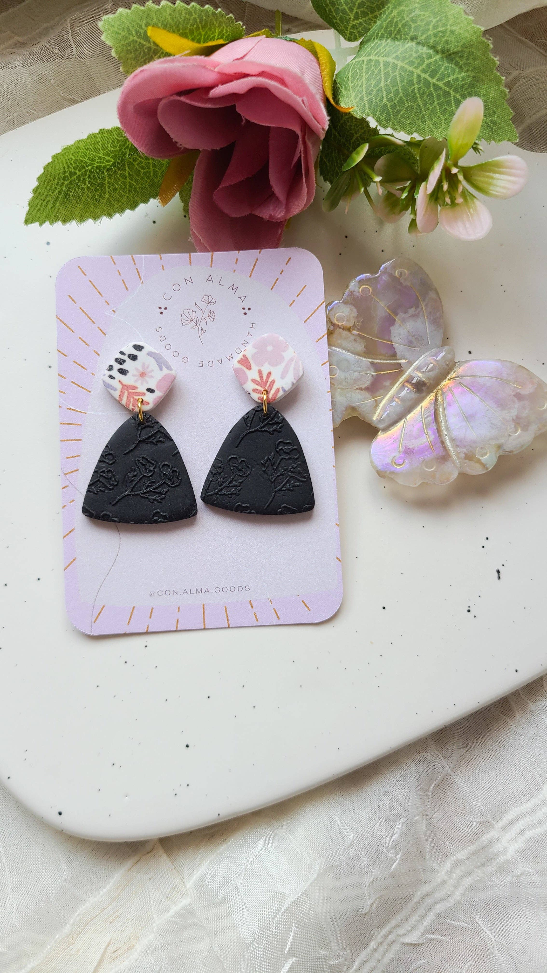 Hello lovelies! My name is Kimberly and I am the creator behind Con Alma goods. I fell in love with creating clay earring and accessories because of the endless possibilities and techniques clay allows me to create! Con Alma goods was born in 2021, as a way to cope with the pandemic and create beauty during a time of fear and uncertainty. From a hobby to a passion, I love how these pieces come to life and are light weight and one of a kind. Con Alma means "with soul" and I strive to make all my pieces with both heart and soul so you can own a piece that truly is as unique as you! I grew up wearing big statement earring but hated when I'd have to remove them due to the weight of the earrings! Clay is an amazing, light weight alternative that can truly take on limitless shapes. Creating my pieces sometimes feels like a dance as my favorite technique, the stone look, can come to life on its own. I truly hope you feel as beautiful as I do while wearing these pieces and can't wait to see how you style them!