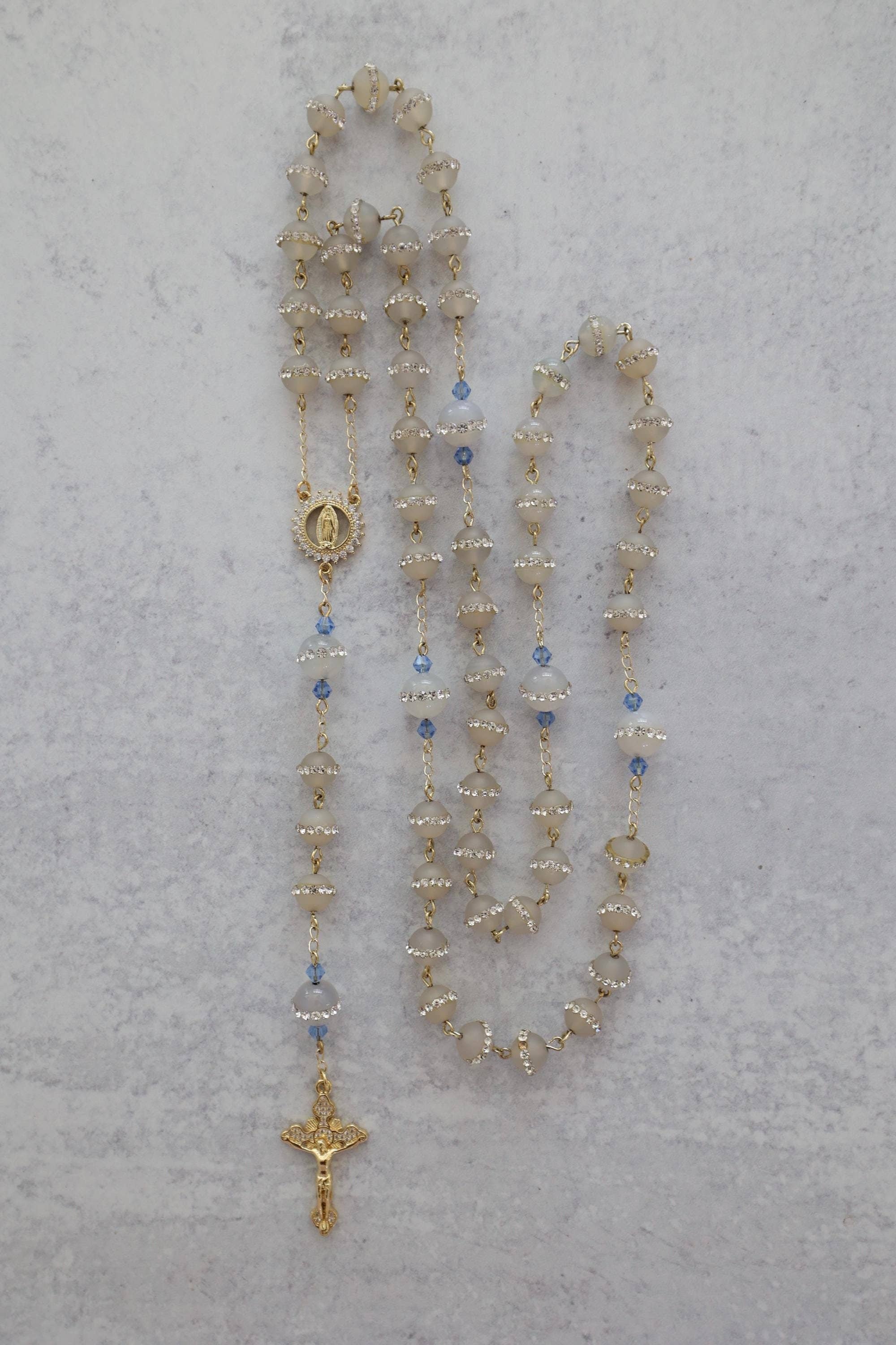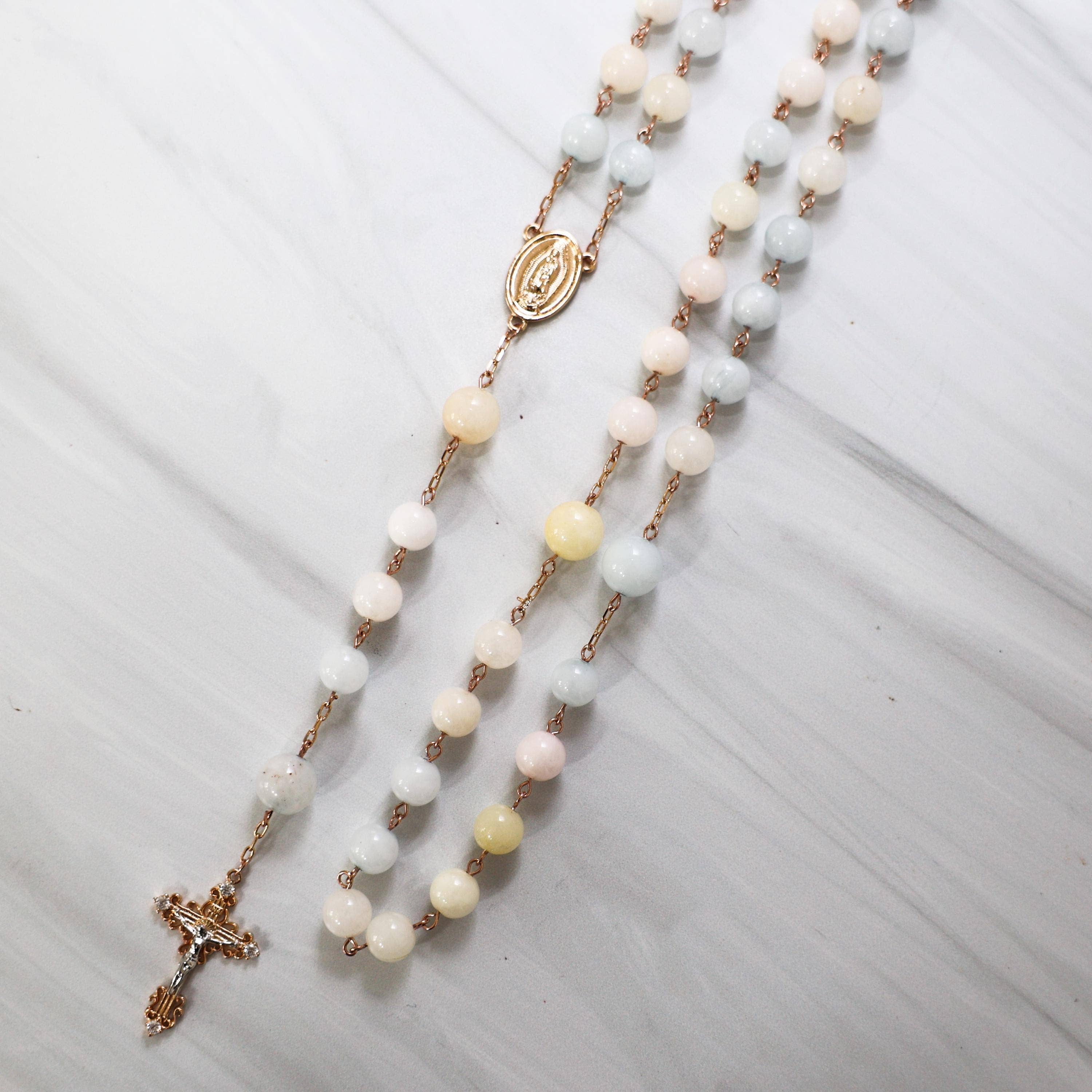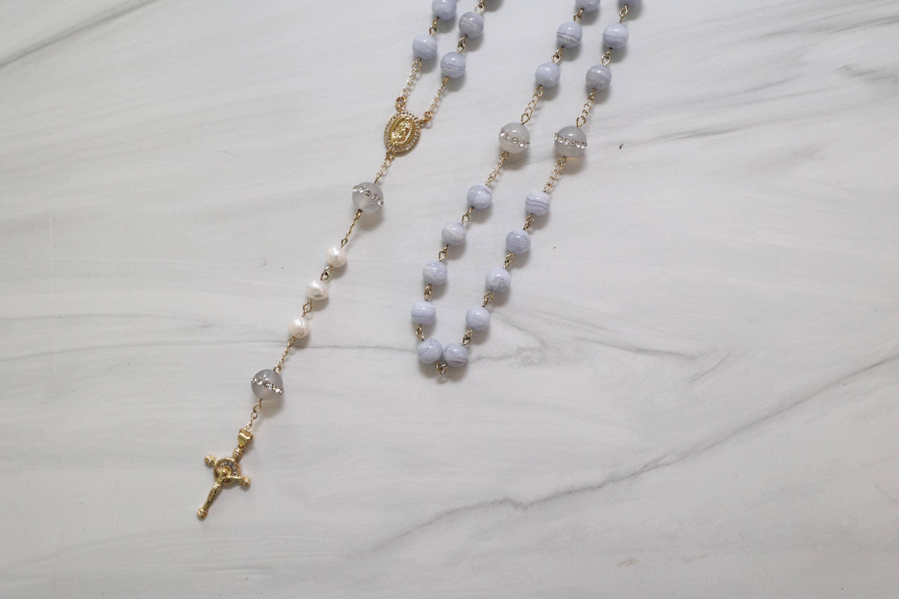 One rosary changed everything for me. 🩷 I found it at the Mission of San Juan Capistrano. At the time, I wasn’t religious, but I was struck by its beauty and I had to have it. That simple moment led me to read Praying the Rosary Like Never Before, to pray, and to learn more about the Catholic faith. As I continued to explore, I began crafting my own rosaries to gift to friends and the Church, and eventually entered RCIA. In 2023, I was received into the Church, receiving all my sacraments, including the Sacrament of Matrimony later that year. 🕊️💒 That experience became the heart of this brand. My mission is to create rosaries that move hearts the same way mine was moved... pieces that inspire prayer, devotion, and love for Our Lady, and invite others to share the faith. Each rosary is handmade with the highest quality gemstones and 18k gold findings, crafted with intention, reverence, and the hope that it will do for someone else what that first rosary did for me. 🤍 Many of the rosaries I make mark personal moments in my own life, including my wedding. One of our bestsellers is the Something Blue rosary I made for my bouquet, along with our wedding lasso and family rosary, Her Heart Shines. Every piece tells a story of faith, love, and devotion - created to be prayed with, treasured, and passed on. 🙏