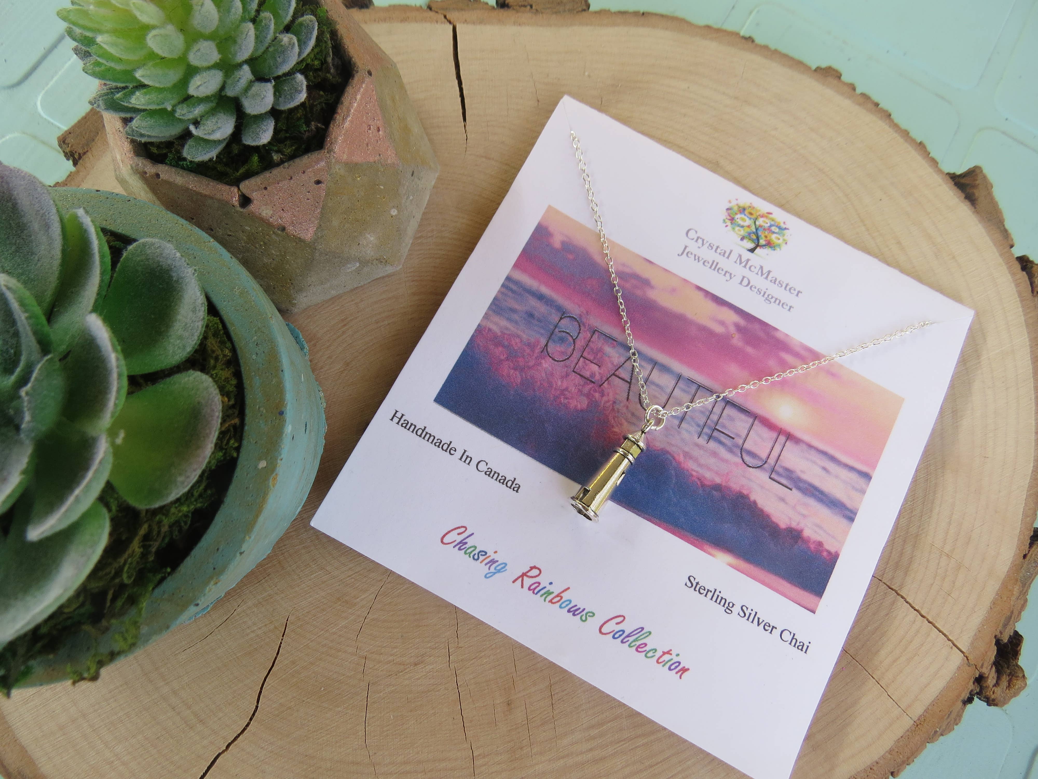 Crystal McMaster began designing in 2005, her works have now been featured in over 200 boutiques, galleries and gift shops across the world. Crystal handcrafts each unique piece at her home studio near London, Ontario. Her jewellery is known for its modern, one of a kind, artisan qualities. Specializing in a glamorous fusion of classic designs and trend setting collections her pieces are timeless. Her collections are thoughtfully crafted with intention and meaning behind them. To fulfill her mission Crystal adds Positive Affirmations and Intention Statements on each card. She also donates a portion of proceeds of each design to Grief Support & Charity Programs. She became a Grief Advocate after losing her beautiful Mom to breast cancer in 2019. Crystal loves designing around a unique element like in her Ink Art Collection, where she created Original Artwork to incorporate into each piece. She also loves using found and recycled woods, and has incorporated acorns, driftwood, handmade wooden beads and fallen tree branches to design pendants and new collections. All of her designs are nickel, cadmium and lead free. Crystal loves being surrounded by nature and lives a very earth conscious lifestyle. Her collections are reflections of that philosophy.
