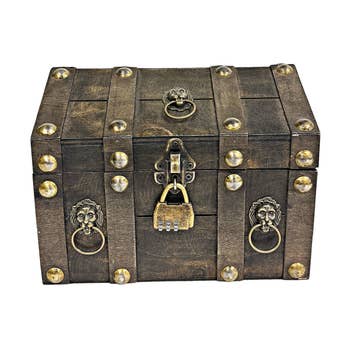 Make your wedding favors feel like a special treat with these miniature treasure chests from The Knot Shop. Each of these small treasure chest boxes features a vintage-inspired look complete with real wood, a small, ornate metal latch, and a rugged ancient treasure map finish. These small pirate chests are a great fit for a number of wedding themes, including nautical weddings, travel-themed weddings, beach weddings, destination weddings, and vintage-inspired weddings. Fill each chest with candies or other gifts for your guests to turn them into charming wedding favors. Alternately, you can incorporate them into your decor for the reception by filling them with fake gold coins, sand, shells, or other little items. Per Package: 6. Contents not included