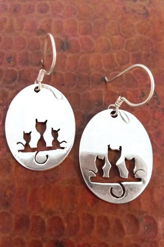 Two cats with different postures one standing on the hoop the other sitting on the wire. The cat silhouettes are sawed with brass metal sheets and then soldered onto the sterling silver 40mm wide circles. Available in necklace style too. Brass Cat Mismatched Cat in Action Earrings.