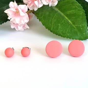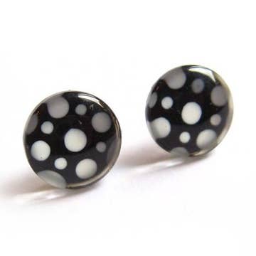 A gradient of polka dots on a black background. All earrings are made with hypo-allergenic, nickel-free titanium posts.