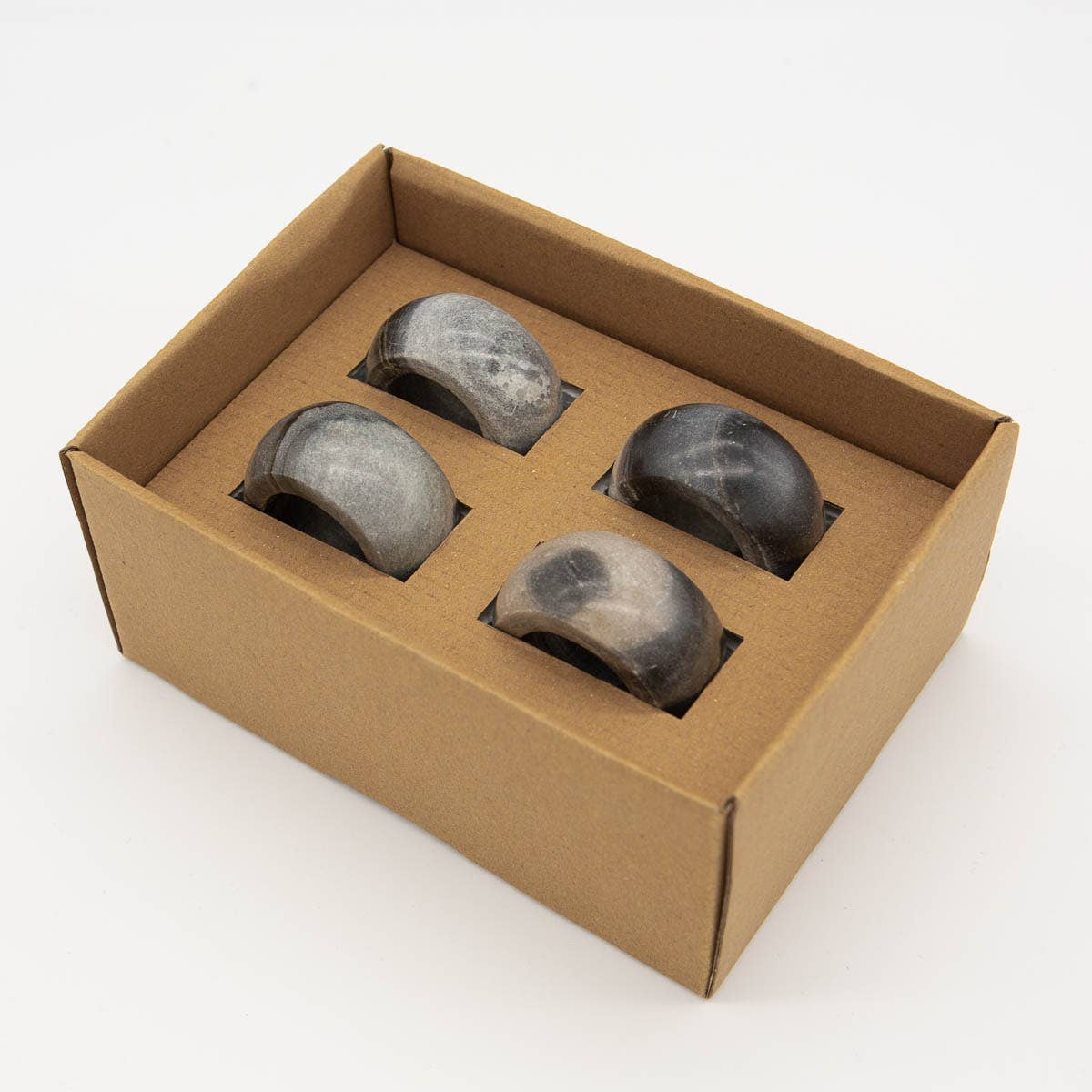 Set of 2 napkin rings. Made of reclaimed horn. Mostly black with some lighter accents. Made in Ghana.