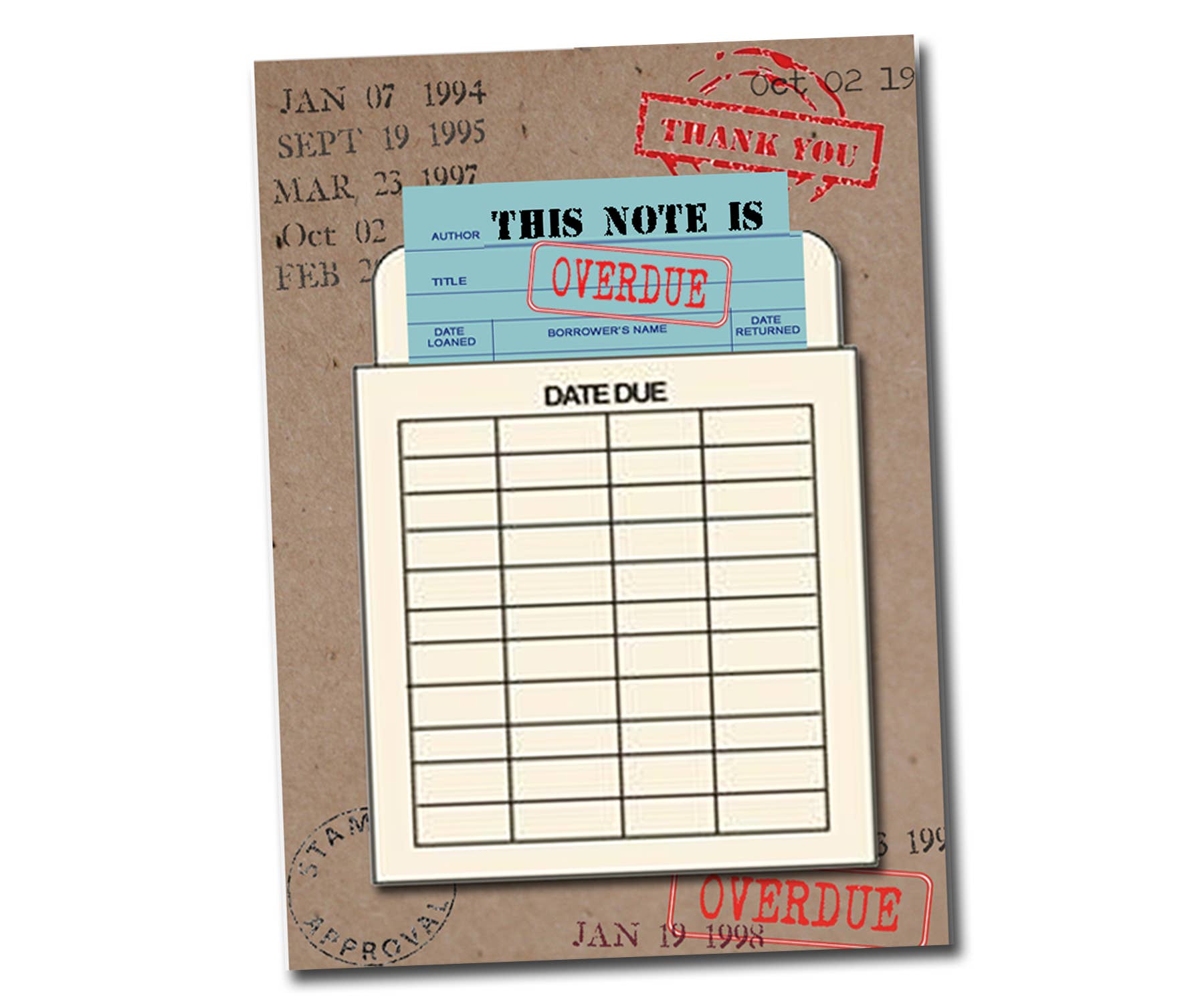 Printed on heavy weight kraft paper in Ann Arbor, Michigan. A vintage book pouch is attached to the front of the card and a special message is printed onto a vintage 'date due' card, which slids into the pouch. Each card is greeted on the inside with both text and a cute graphic image. The cards are packaged in clear cellophane with a cream colored envelope.