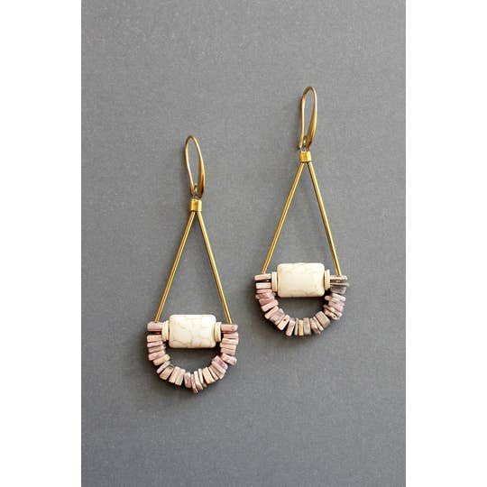 Our mother of pearl shell cage dangles are a classic. Each shell encrusted earring that is draped in gold fill and seed pears, on gold fill ear wire. Each pair is created of natural materials, so some some variation in size us expected. Roughly 2.0 inches long by 1.3 inches wide.