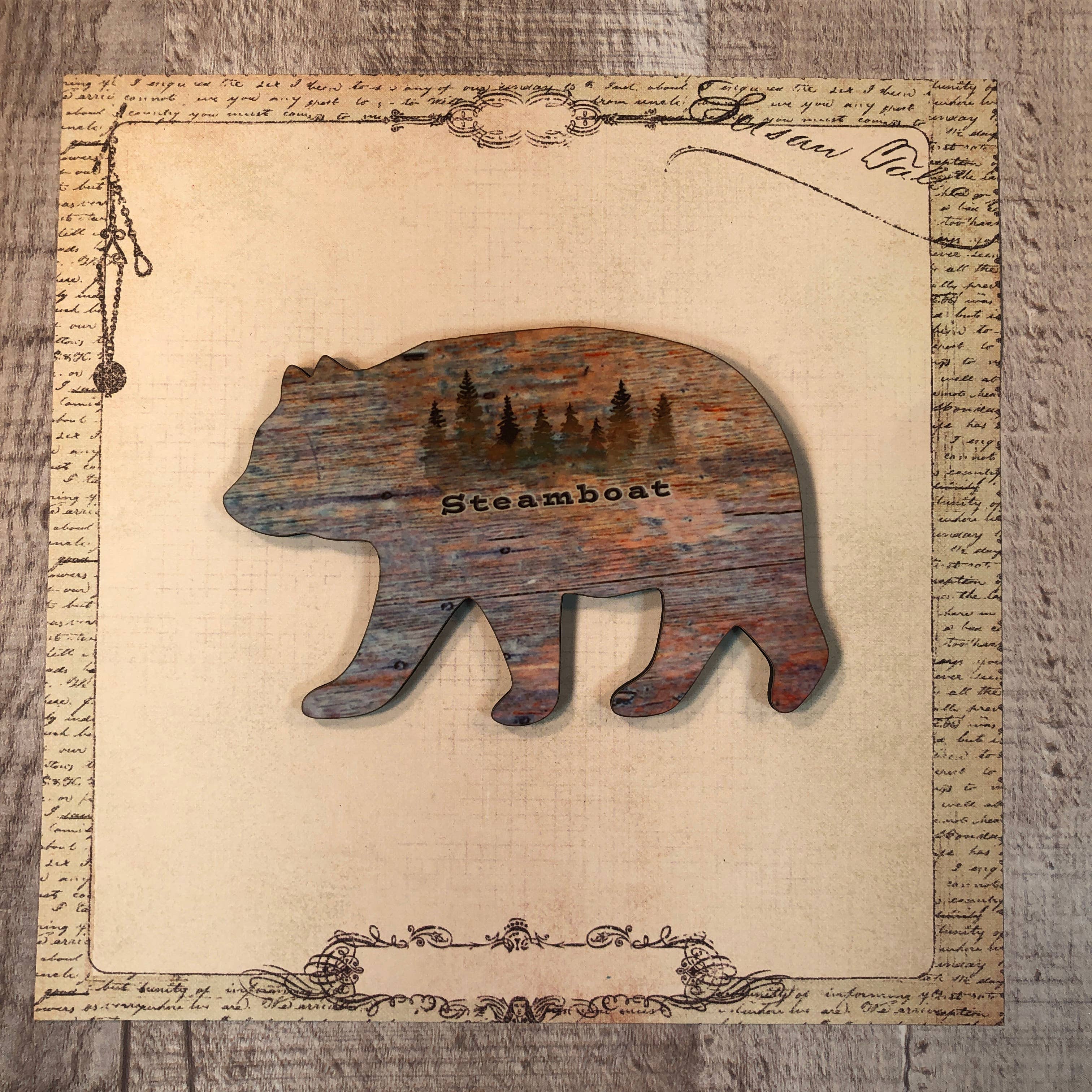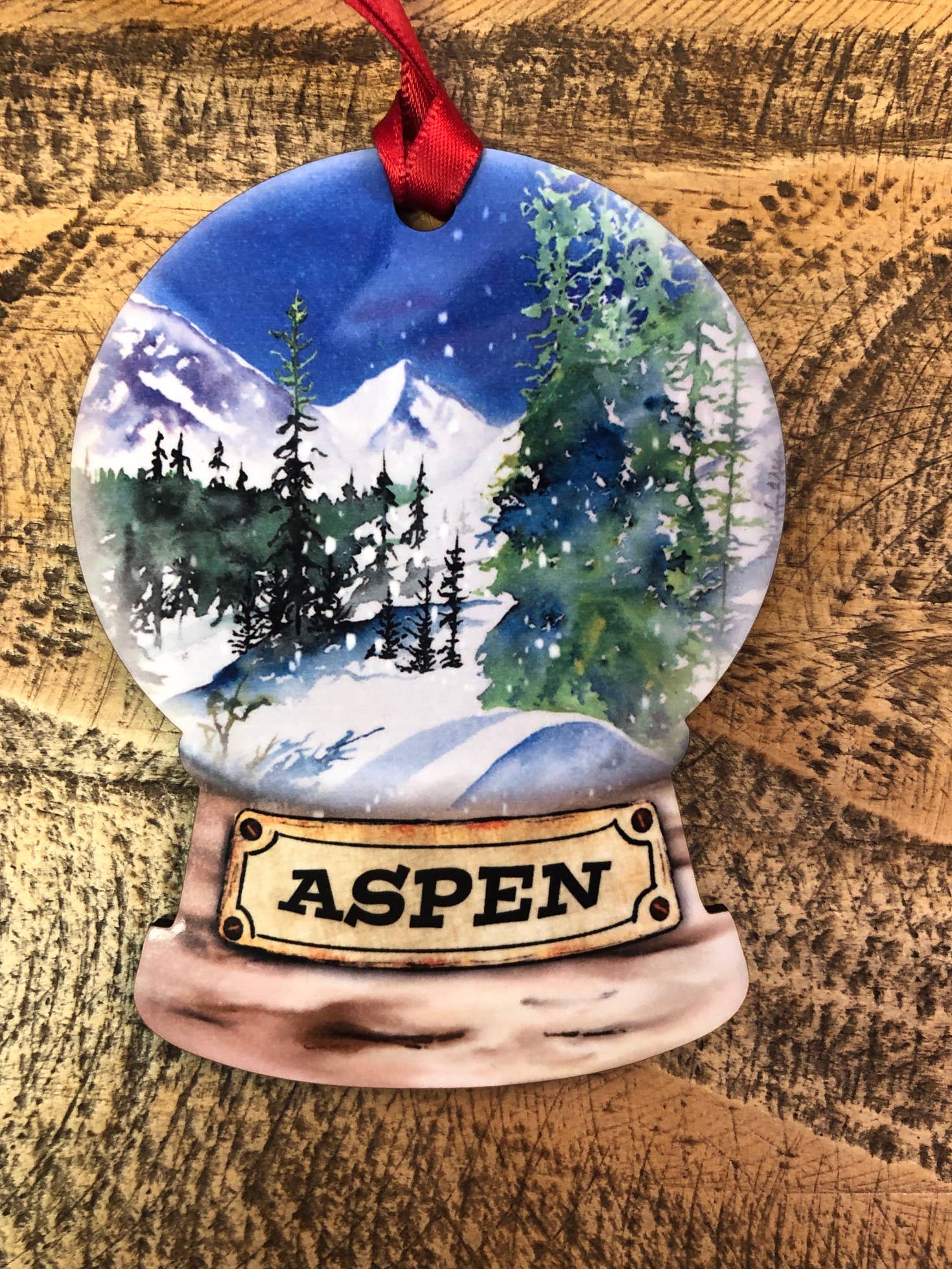 Mountain stream in winter scene snow globe ornament , 4''H hardboard one sided ornament with hanging ribbon attached. This item can be name dropped with , town, state , or resort.