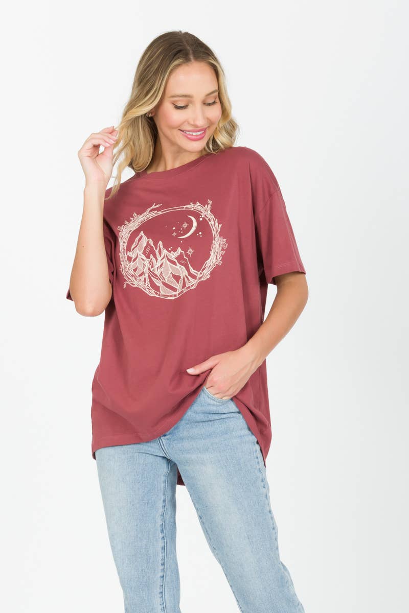Color: sage green. Inspired by an epic road trip through the Badlands & Black Hills of South Dakota, this desert landscape print features a setting sun just before it disappears behind a cascading sea of rocky mountains. Printed on a loose-fitting, rolled cuff muscle tee and available in sizes S-2XL. These tops are super soft, lightweight and breathable. Perfect for yoga and post-workouts. Color is sage green with fuchsia and dark gray ink. Model shown is 5'8, size 8 (36B bust), and she's wearing a LARGE in this style.