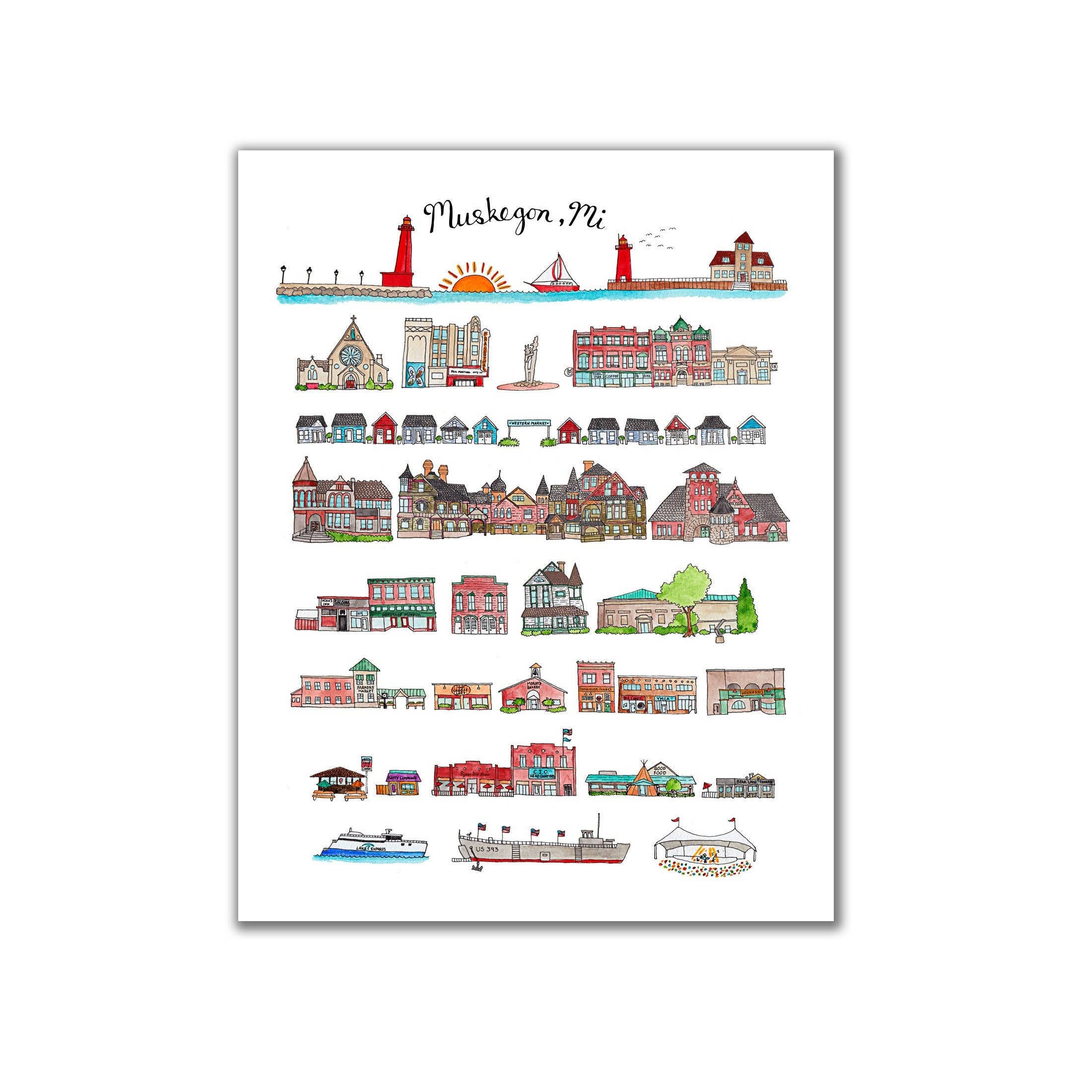Jodi Lynn's Emporium of Doodles brings you the Muskegon MI Card, an everyday greeting card with a unique touch. This blank 4" X 5" card, rendered in English, is perfect for any occasion. Inspired by her love for learning and pop culture, Michigan-based illustrator Jodi Lynn creates pieces that add brightness to anyone's day. Whether it's city portraits or imaginary animal dwellings, her quirky illustrations cater to all tastes.