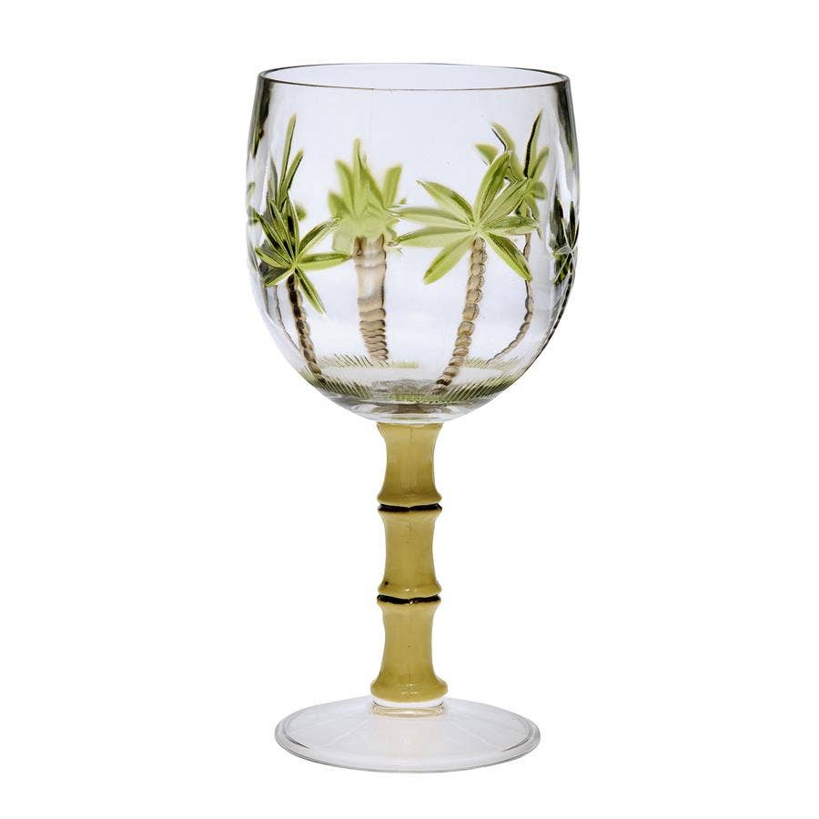 Item# AC-0603 UPC# 876770000812 Unit Measure: 8"H x 3.63"W Unit Weight: 222 grams Keep the patio drinks pouring with this stylish Wine Glass! Made from plastic and acrylic, it showcases colorful palm trees with a bamboo stem handle – making it perfect for coastal homes or beach-inspired aesthetics. Its machine-made construction renders it shatter-proof, so there’s no need to worry when it falls off the table during the backyard barbecue. We recommend handwashing. BPA Free!