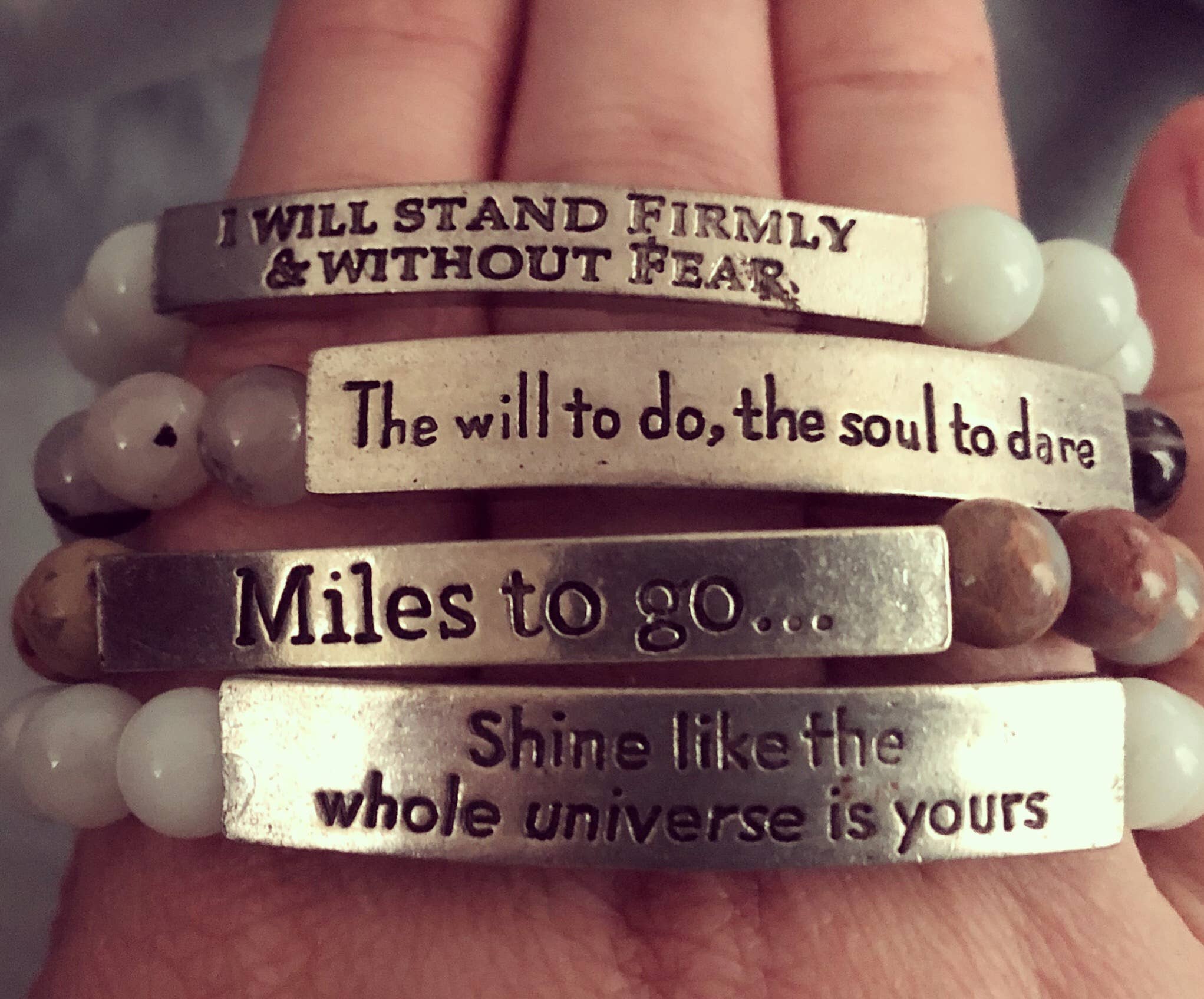 These are beautiful bracelets with a great price point! I have a small shoppe in a small town and am constantly trying to find good quality items with a price point that works for small rural towns. These hit the mark! Only complaint is one bracelet had a few letters that weren’t clear. Other than that, great quality. Beautiful stones. Very pleased.