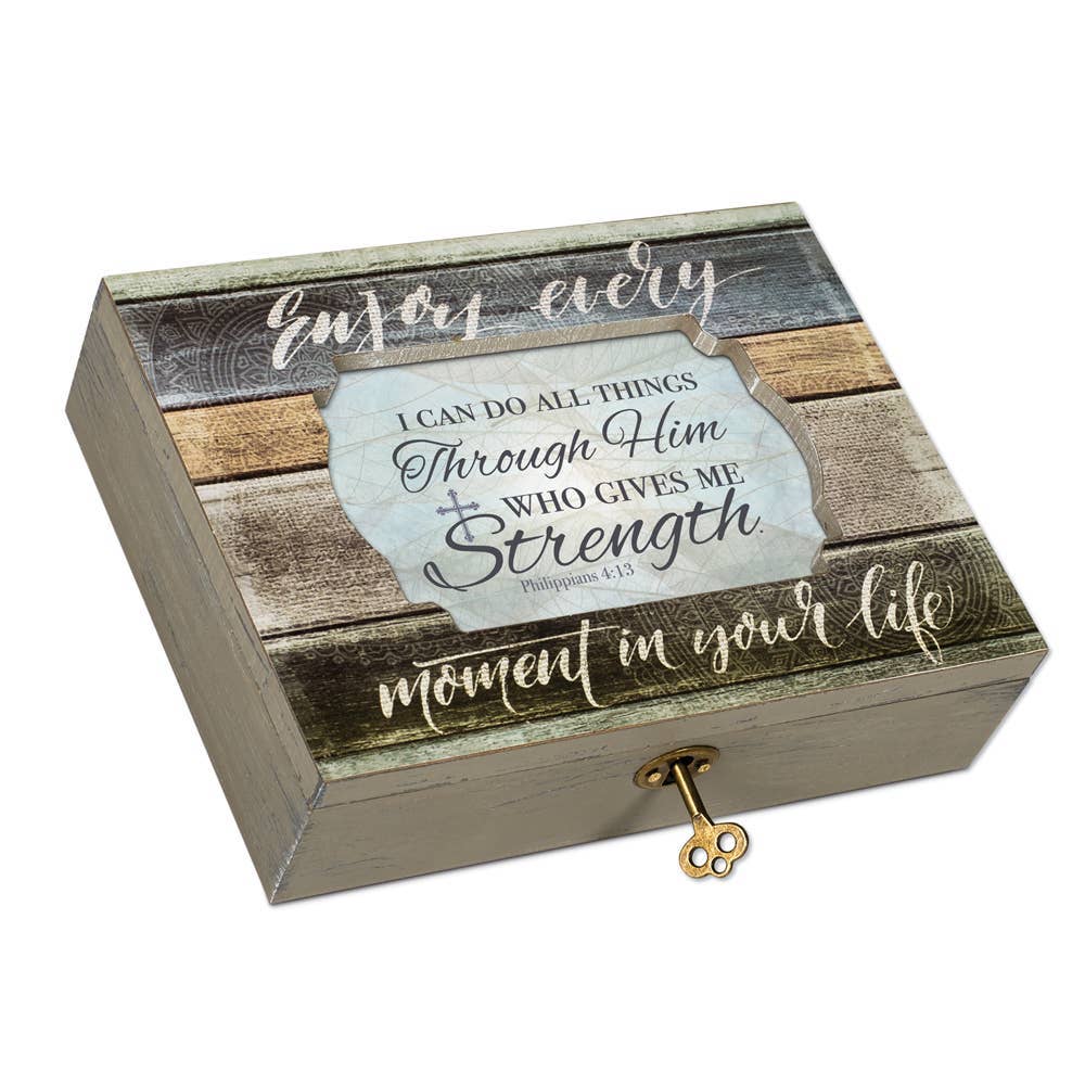 Solid wood material; trendy woodgrain finish with a overlapping circle decoupage design. Hinged jewelry box measures approximately 6 x 4 x 2.25 inches; Features a 3 x 5 inch window opening for personal photos. Functional Antique looking key included with vintage turn-key lock design to secure your keepsakes and is attached to ribbon; Ships individually boxed. Traditional wind-up mechanism engages music to play melodic tune Edelweiss. Plays How great thou art.