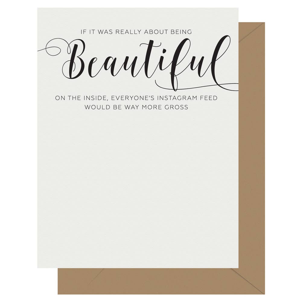 Beauty funny, crass calligraphy letterpress greeting card. Size: A2 Greeting Card (4-1/4" x 5-1/2"). Paper: 110# cotton stock. Front: Beauty fades but dumb is forever. Inside: Blank. Envelope: Brown bag kraft envelope (70# stock, 100% post-consumer waste). Packaging:Â Packaged inside a clear cello sleeve. All of our greeting cards are handprinted (one at a time) on vintage midcentury Chandler & Price letterpress printing presses.