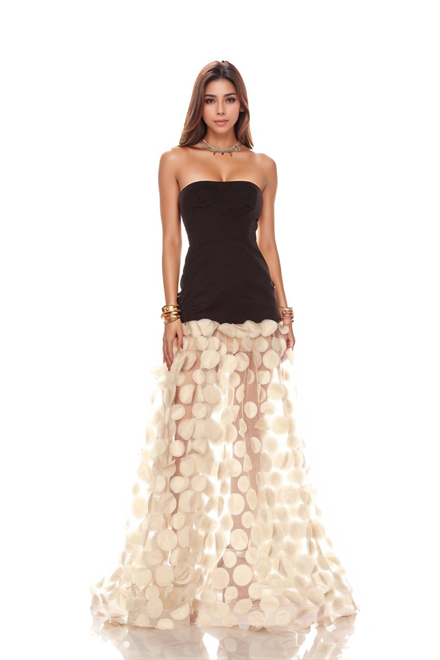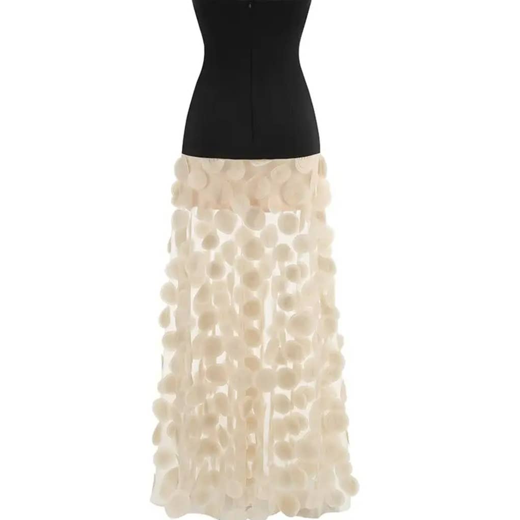 Gracefully sculpted to flatter the silhouette, this one-shoulder bandage evening dress blends modern elegance with artistic flair. The slim fit hugs the body, offering a sleek and refined profile, while cascading three-dimensional floral appliqués add romantic texture from shoulder to hem. Crafted in a rich black fabric, the contrast of soft white blossoms creates a striking visual rhythm that draws the eye. Ideal for formal gatherings, cocktail nights, or upscale celebrations, this dress is a statement of confidence and charm.